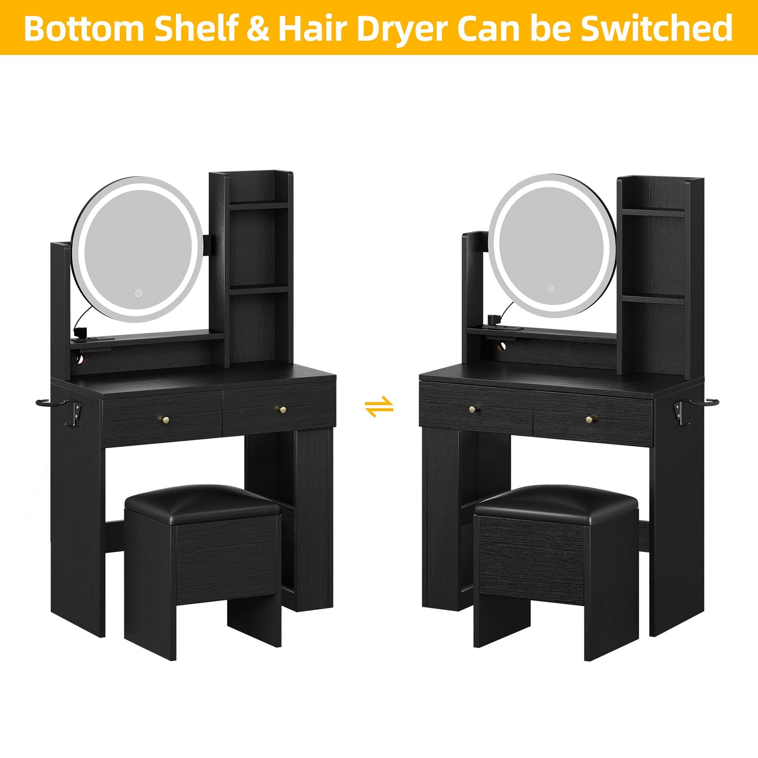 • Customizable and Convenient: Tailor your vanity to your liking with movable bottom shelves and hair dryer rack; position them on the left or right to suit your space and needs. Flexibility is key - make the makeup table work for you