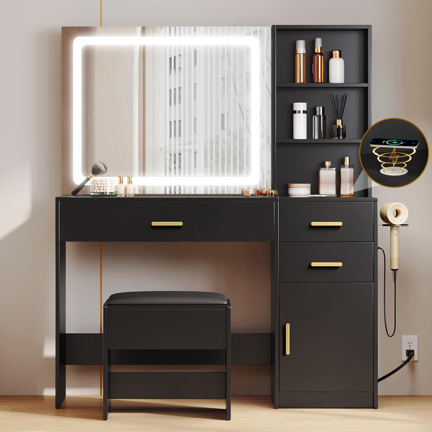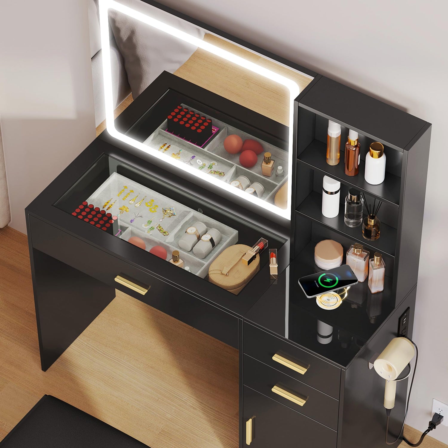 YITAHOME Vanity Desk Set, with Wireless Charging Station &Power Outlet, Vanity Mirror with Tempered Glass Top & Large Storage Spaces Vanity Table Set, Black