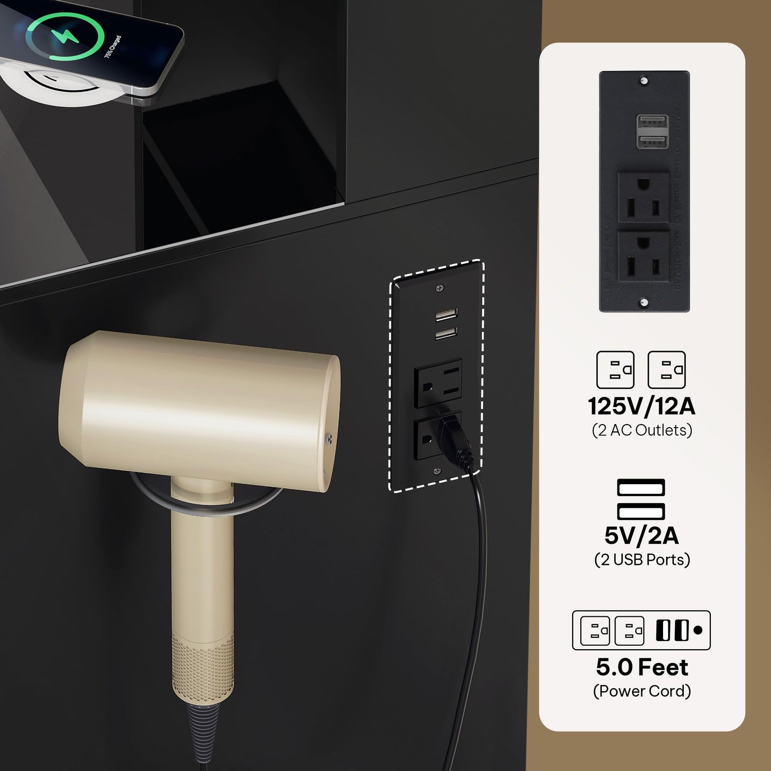 • Wireless Charging & Power Outlets: Keep all your devices charged and ready with multiple charging spots. Power up your mobile in just 1.5-2 hours on the tabletop, and use the 2 USB ports and 2 AC outlets for your hair styling tools. Stay prepared for the day ahead
