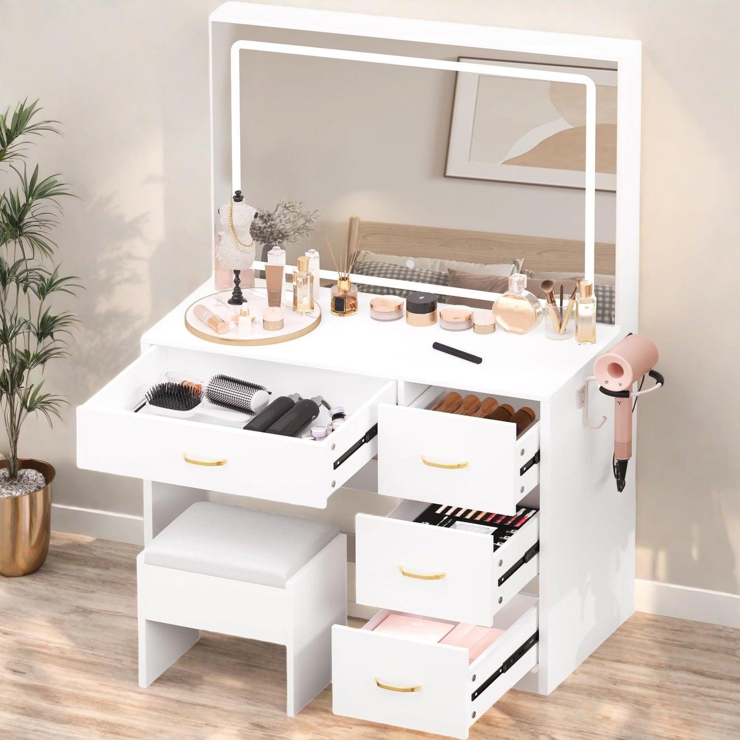 Details: Illuminate Your Beauty Routine: The generously sized 31.29" x 20.27" mirror provides an expansive view, while the integrated LED light strip offers 3 color modes to customize the ambiance. The touch-sensitive brightness control allows you to achieve the optimal illumination for your beauty routine. Ample Storage Space: The makeup vanity desk, measuring 35.43" L x 15.74" W x 53.54" H, features 4 generous drawers to neatly organize your cosmetics, perfumes, makeup brushes, hair styling tools, and jewelry, ensuring user convenience. Ultimate Convenience: The vanity desk is designed with user convenience in mind, featuring 2 AC outlets and 2 USB ports to power your hairdryer and other gadgets. It also includes a dedicated hair dryer rack, keeping your styling tools easily accessible. This makes it the ideal chic makeup station for your dressing room, bedroom, salon, or even live broadcasts. Comfort and Safety: The vanity set includes a plush, cushioned chair for optimal comfort during makeup application. Additionally, the vanity desk is equipped with an anti-tip device that securely anchors the unit to the wall, providing peace of mind and ensuring the stability of your vanity as you get ready. Assembly Made Easy: Assembling the vanity desk is a stress-free experience, with clearly labeled parts and straightforward step-by-step instructions.