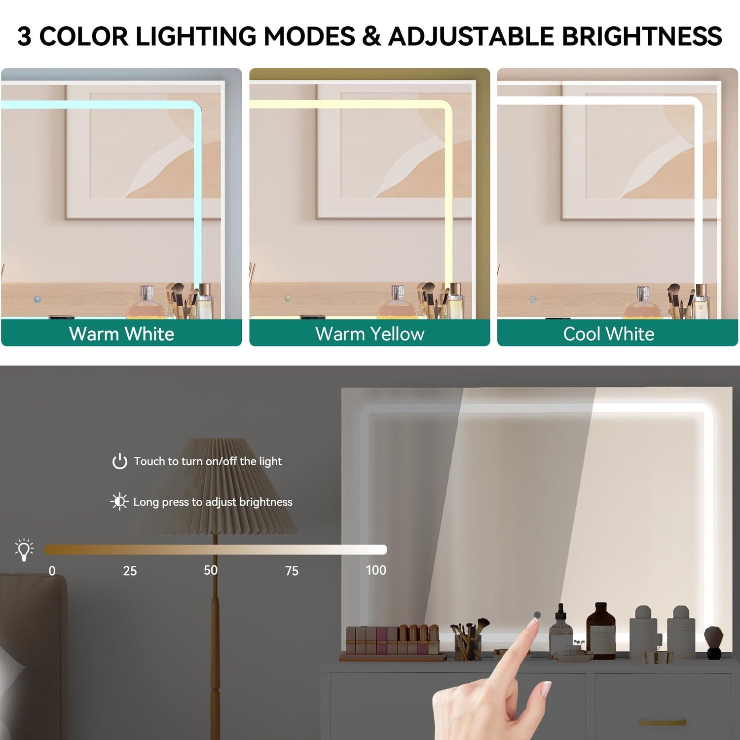 - Illuminate Your Beauty Routine: The generously sized 31.29" x 20.27" mirror provides an expansive view, while the integrated LED light strip offers 3 color modes to customize the ambiance. The touch-sensitive brightness control allows you to achieve the optimal illumination for your beauty routine.