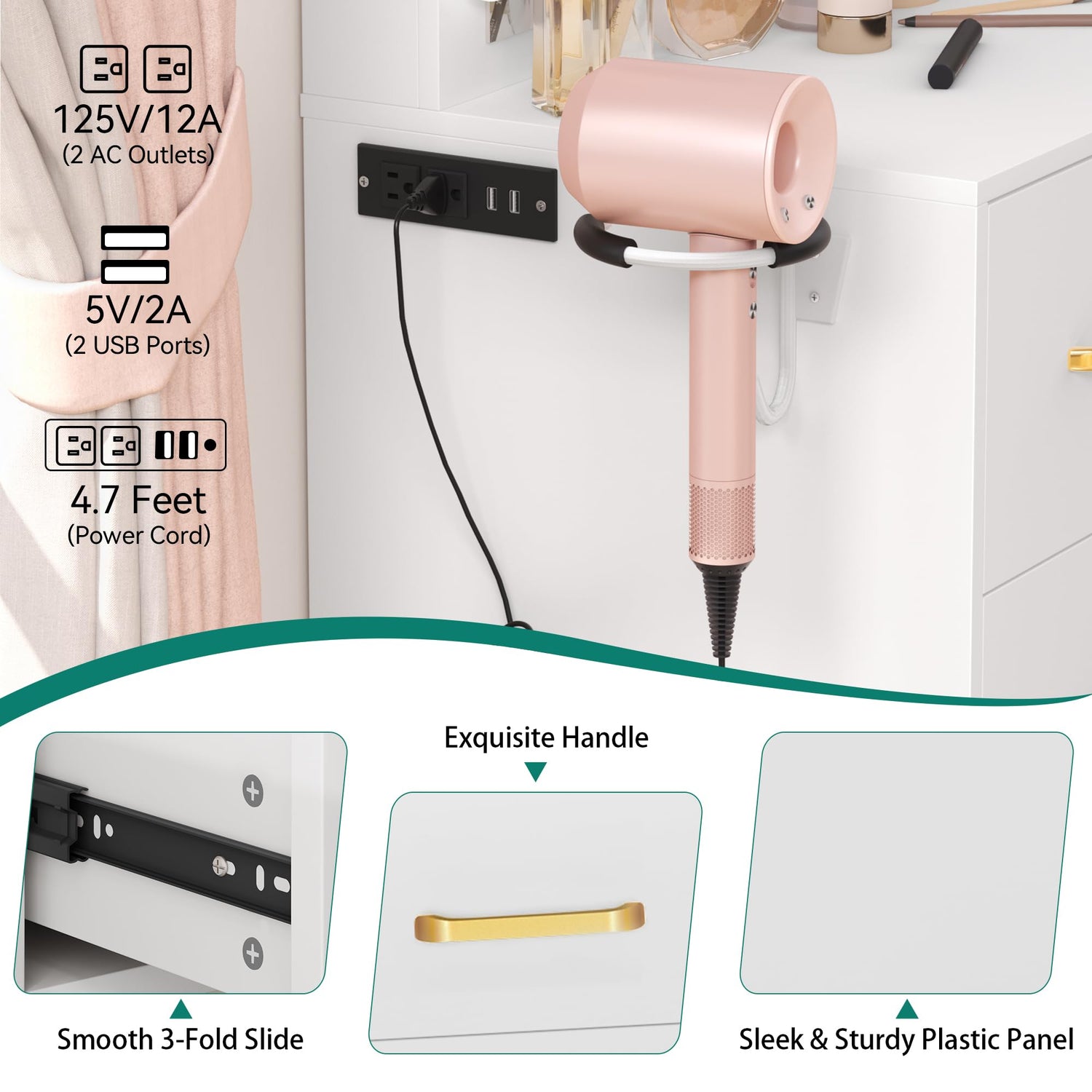 - Ultimate Convenience: The vanity desk is designed with user convenience in mind, featuring 2 AC outlets and 2 USB ports to power your hairdryer and other gadgets. It also includes a dedicated hair dryer rack, keeping your styling tools easily accessible. This makes it the ideal chic makeup station for your dressing room, bedroom, salon, or even live broadcasts.