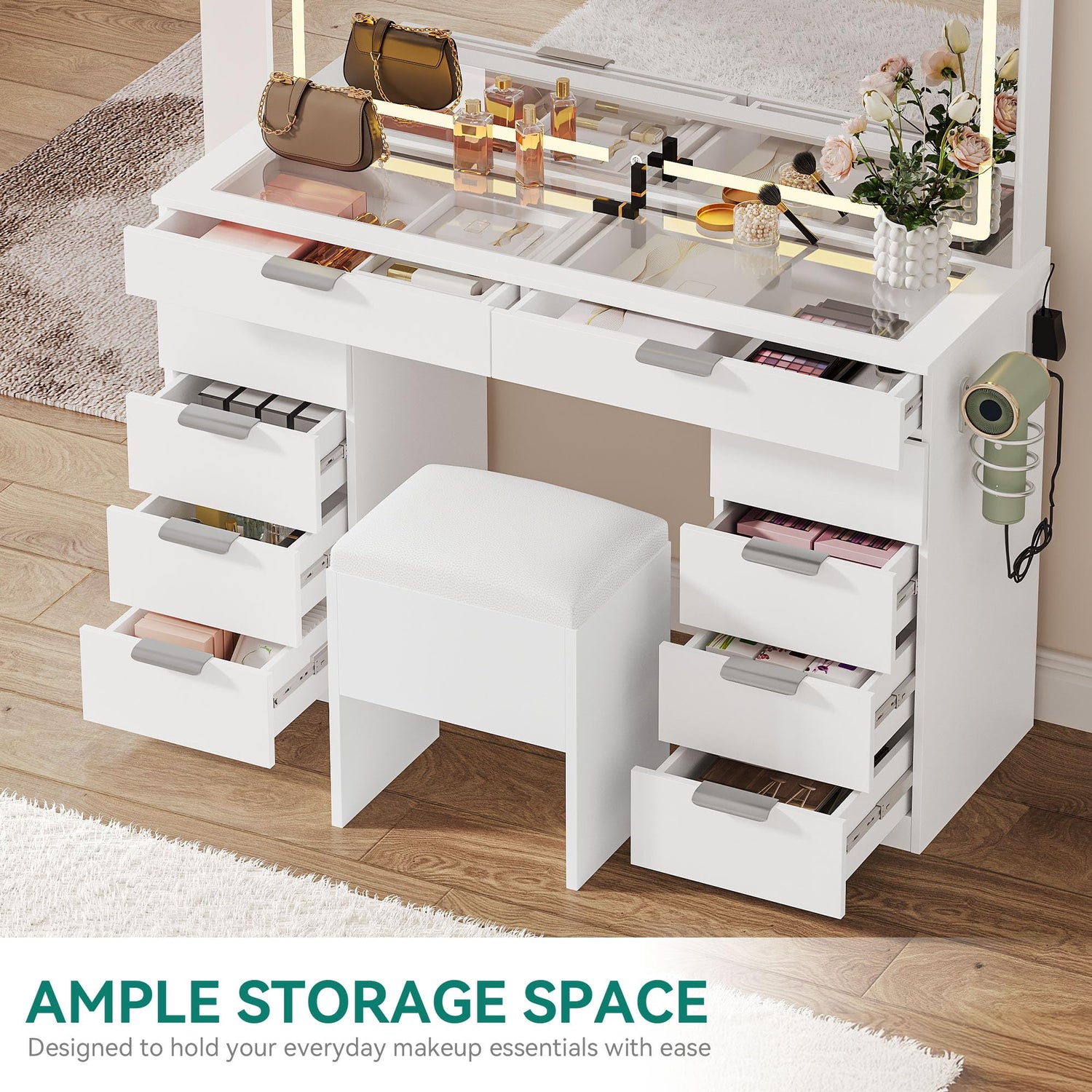 YITAHOME Vanity Set, Makeup Vanity Desk with Adjustable LED Mirror, Power Outlets, 10 Drawers, Magnifying Glass, Tempered Glass Top, Hairdryer Holder, Stool for Bathroom, Makeup Room