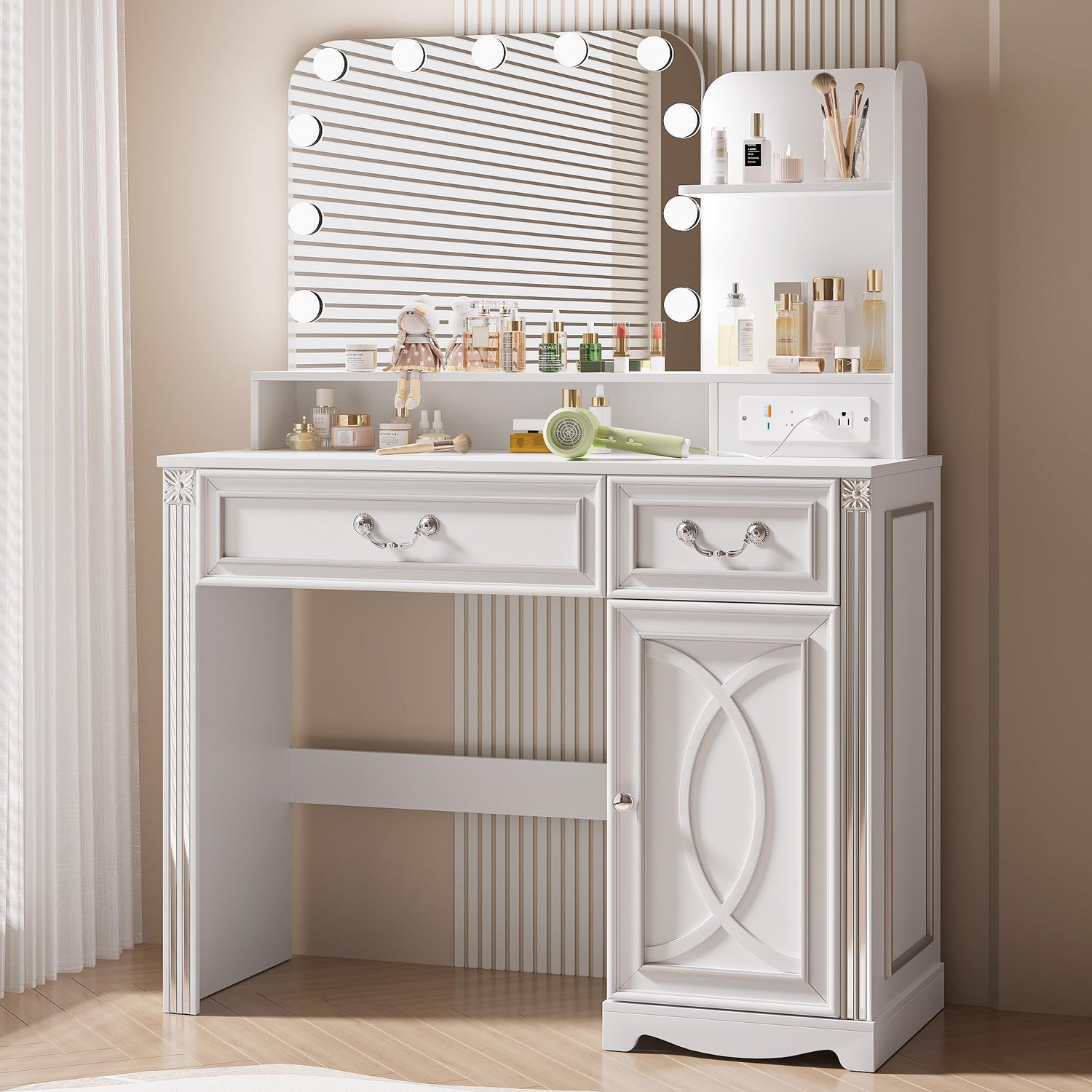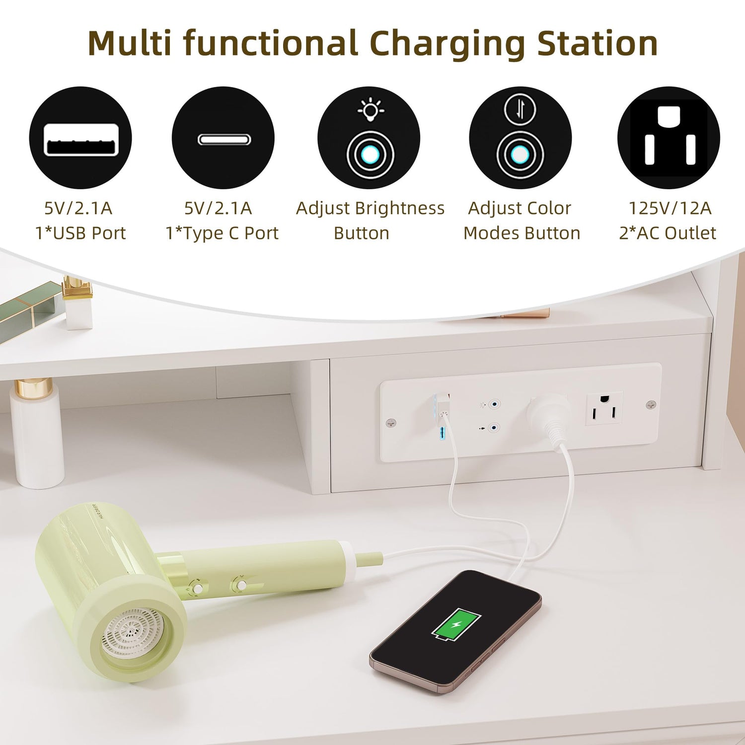 - 【Ample Storage Space & Power Outlets】Dressing table with 1 desktop with 1 shelf, 2-tier shelves, 1 large drawers, 1 small drawer, 2-tier cabinets can store all makeup and other stuff. AND Built-in multifunctional charging station, 2 AC Power Outlets, 1 Type-C port and 1 USB port are ready for phone, hair drier and others tools.