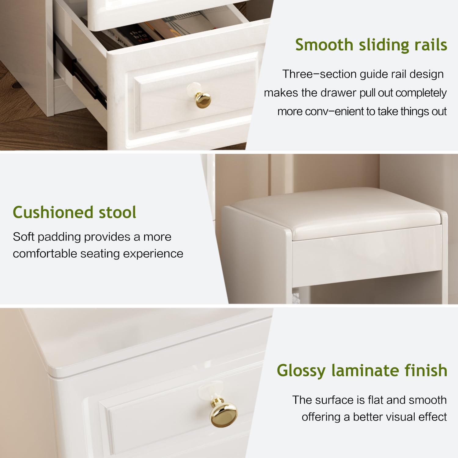 - 【Vanity with Lights】White makeup vanity features a high-definition makeup mirror with LED light. It has 3 different color modes (cool light, natural light, warm light) and the brightness of each light color. Makeup vanity freely meets your makeup needs for different occasions.