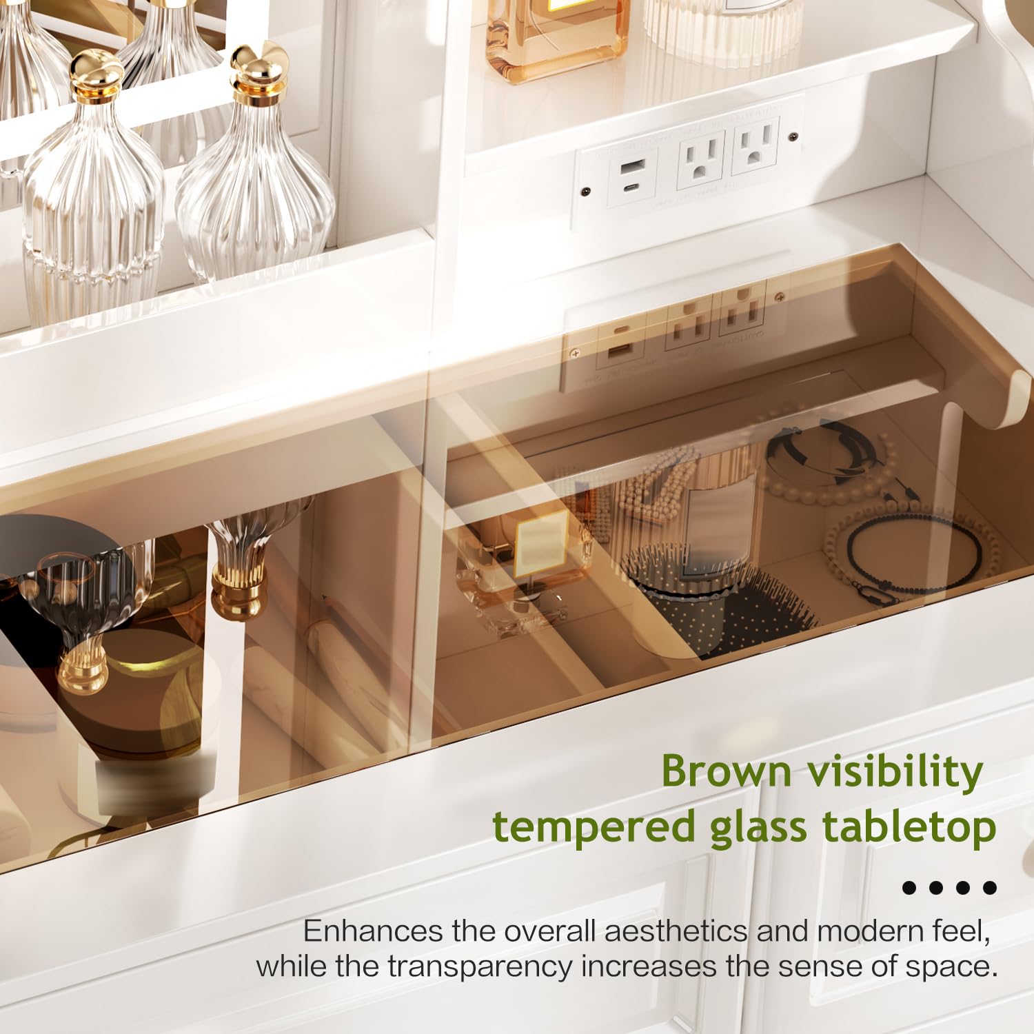 - 【Built-in Power Strip】Upgrade design!This makeup table equipped with a power strip that has 2 standard plug sockets ,1 USB ports and 1 T-C with a 4.9-foot power cord,convenient for the LED lights,hairdryer, curling iron, and charge your phone, tablet, or other electronics.