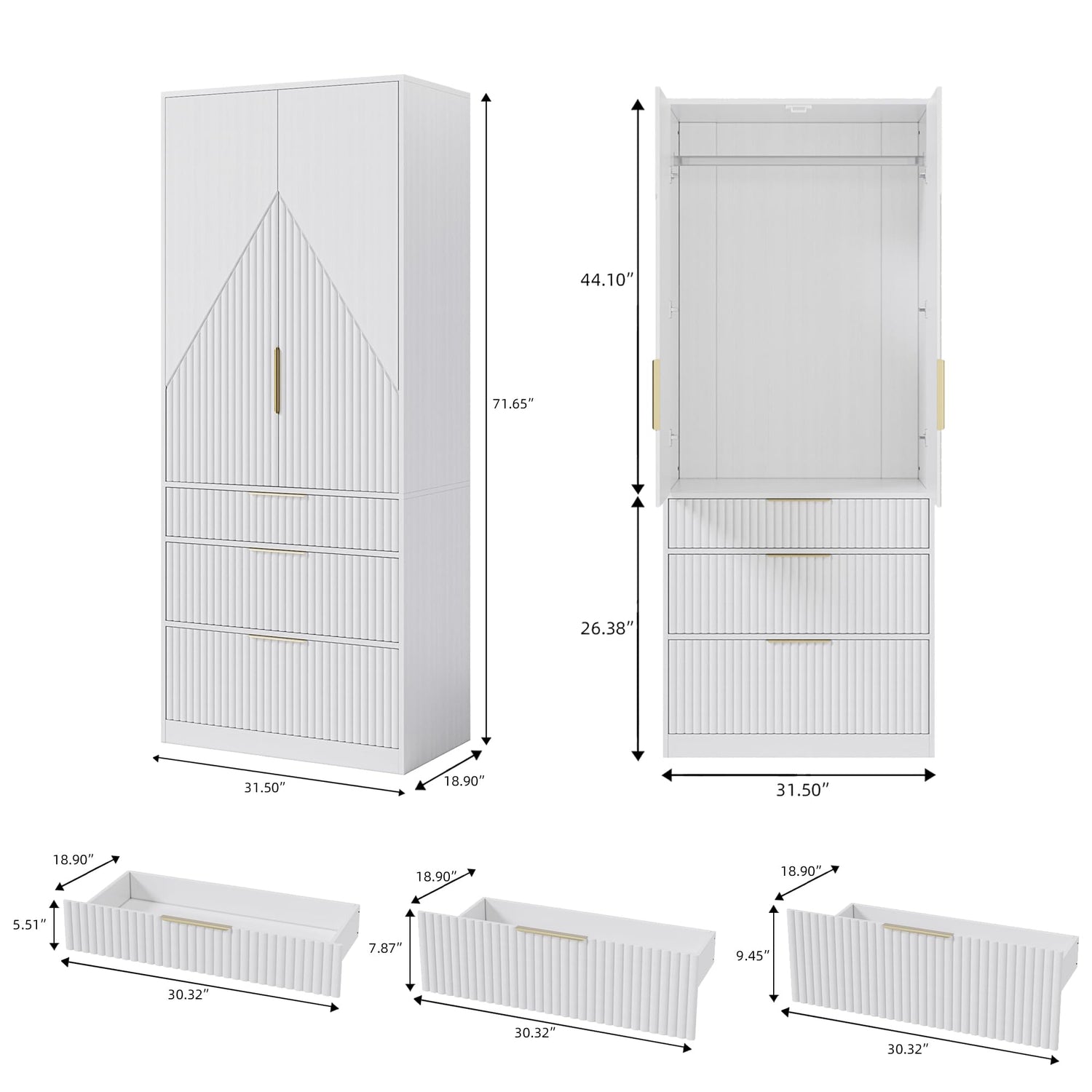 71.7 " Wardrobe Armoire Wooden Closet with 2 Doors and 3 Drawer, Bedroom Armoire with Hanging Rod Shelf, Large Capacity Storage Wardrobe Armoire, Freestanding Wooden Closet Storage Cabinet White