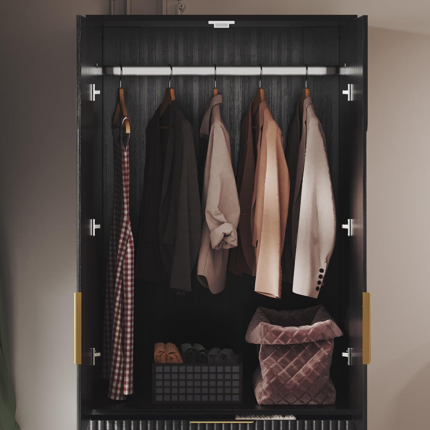 - 【Modern Armoire Wardrobe Closet】 Black wood grain finish of the Wardrobe and delicate edge banding give it a modern and elegant look. This wooden wardrobe is simple, it combines wave panels with gold handles to create luxury charm.This large wardrobe matches well with various house decors. The clean lines and elegant finishes create a sophisticated look, adding a touch of class to your living space. This wooden wardrobe will be a prefect addition to your home. Perfectly with many different house decors.