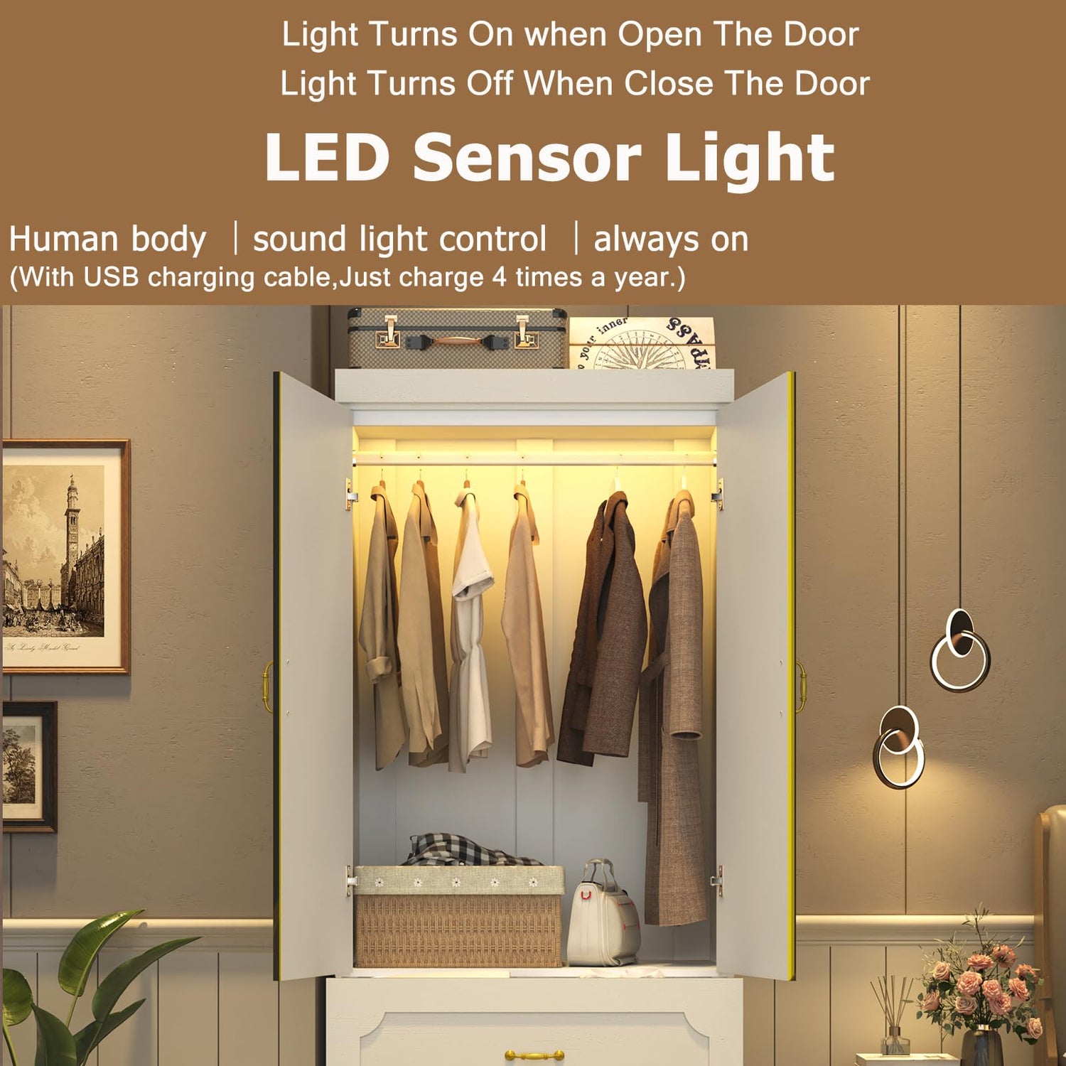 - LED Armoire Wardrobe Closet:this 75" Modern wardrobe closet for bedroom is by Mobile APP and Remote control to control LED lights.the light strip that can adjust 60,000 RGB colors, with color, brightness, and mode adjustment functions, music synchronization function, and timing function.Make your home full of warm atmosphere.