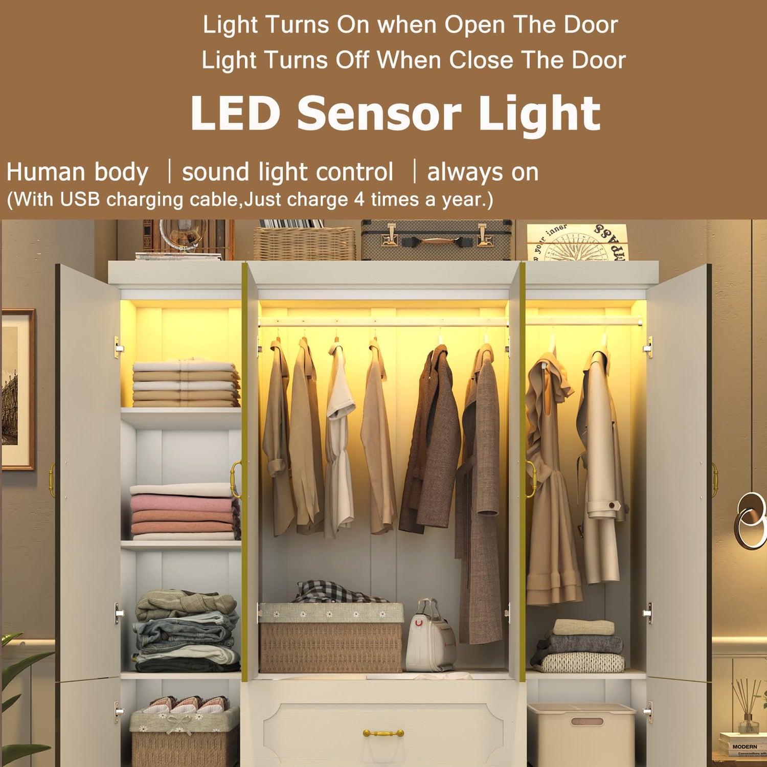 - LED Armoire Wardrobe Closet:This 75in modern wardrobe is equipped with an LED sensor light. The light turns on when you walk into the door and turns off when you walk away from the door, freeing your hands and allowing you to easily find your clothes even in the dark. It is a very convenient feature.Make your home full of warm atmosphere.