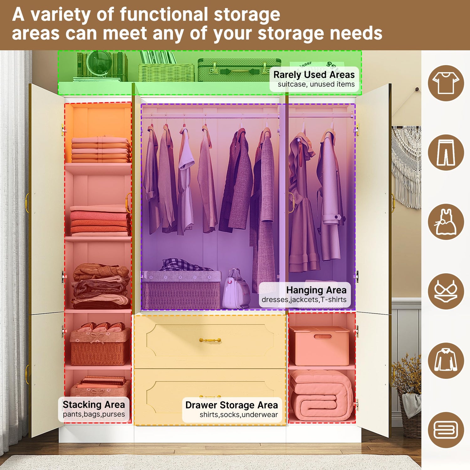 - Huge and Flexible Storage Experience:.Our Freestanding Closet Wardrobe Cabinet is divided into hanging area,drawer area,stacking area and Top box area.Can be stored according to your needs.Whether you need space to hang clothes or store folded items, this versatile storage solution can meet your needs.