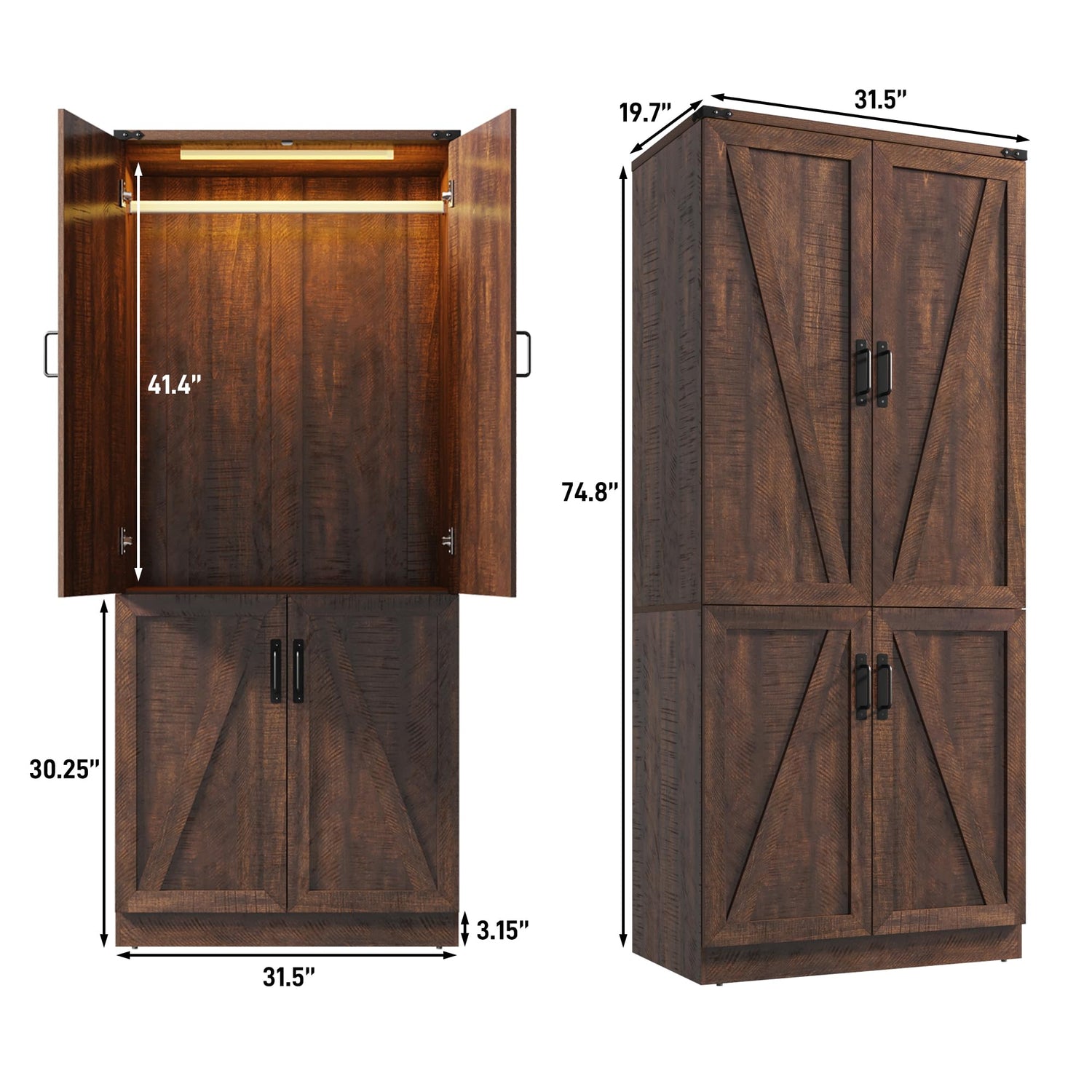 75" Tall Farmhouse 2 Doors Armoire Wardrobe Closet with LED,Freestanding Closet Wardrobe Cabinet for Bedroom with Hanging Rod,Wooden Armoire Storage Cabinet with Adjustable Shelves(Brown)