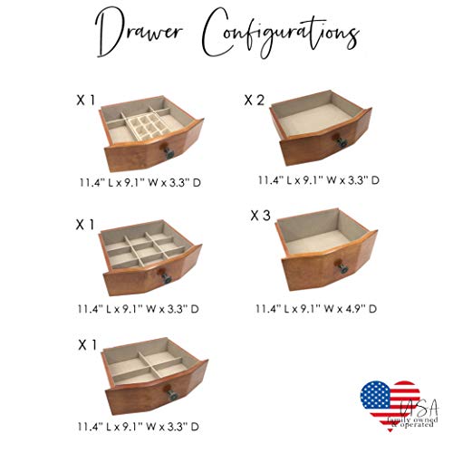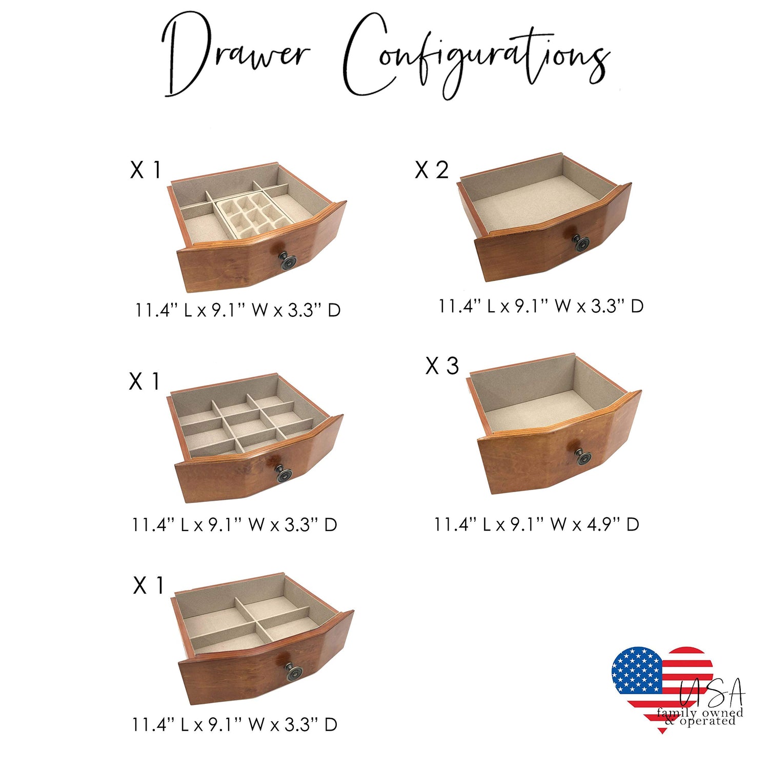 • The 8 drawers are lined and padded, with separated compartments to keep small items organized.