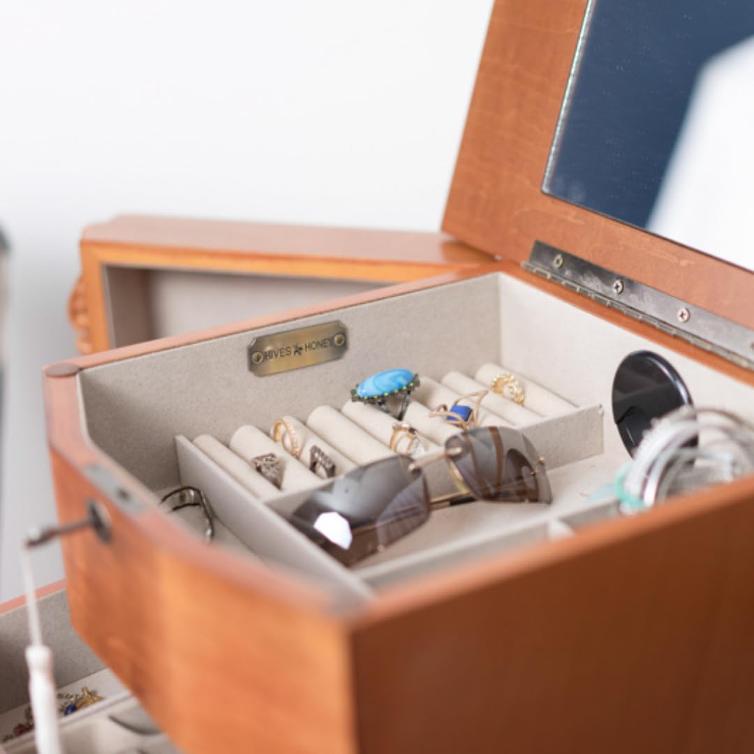 • The top opens to reveal a beauty mirror with divided compartments and ring rolls.