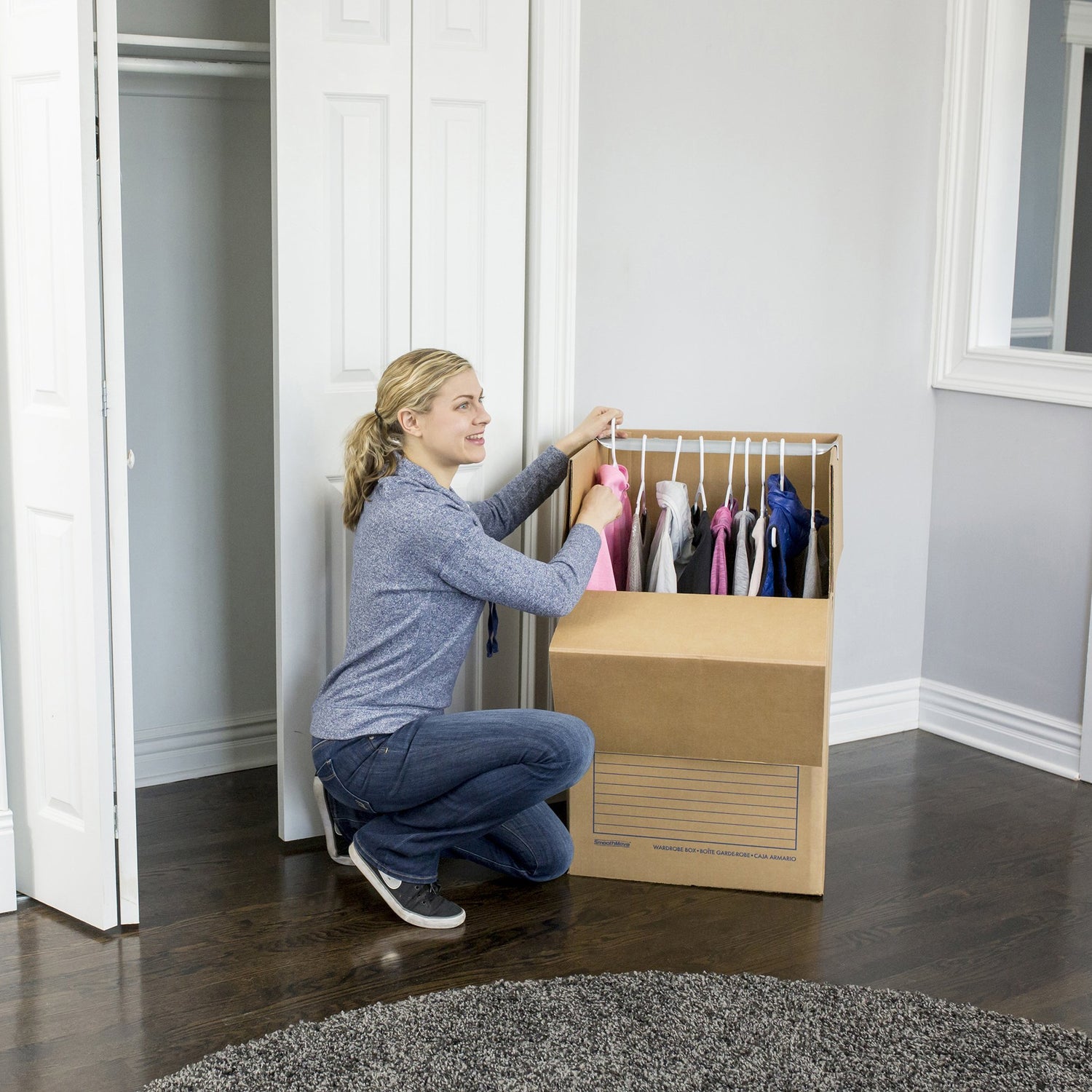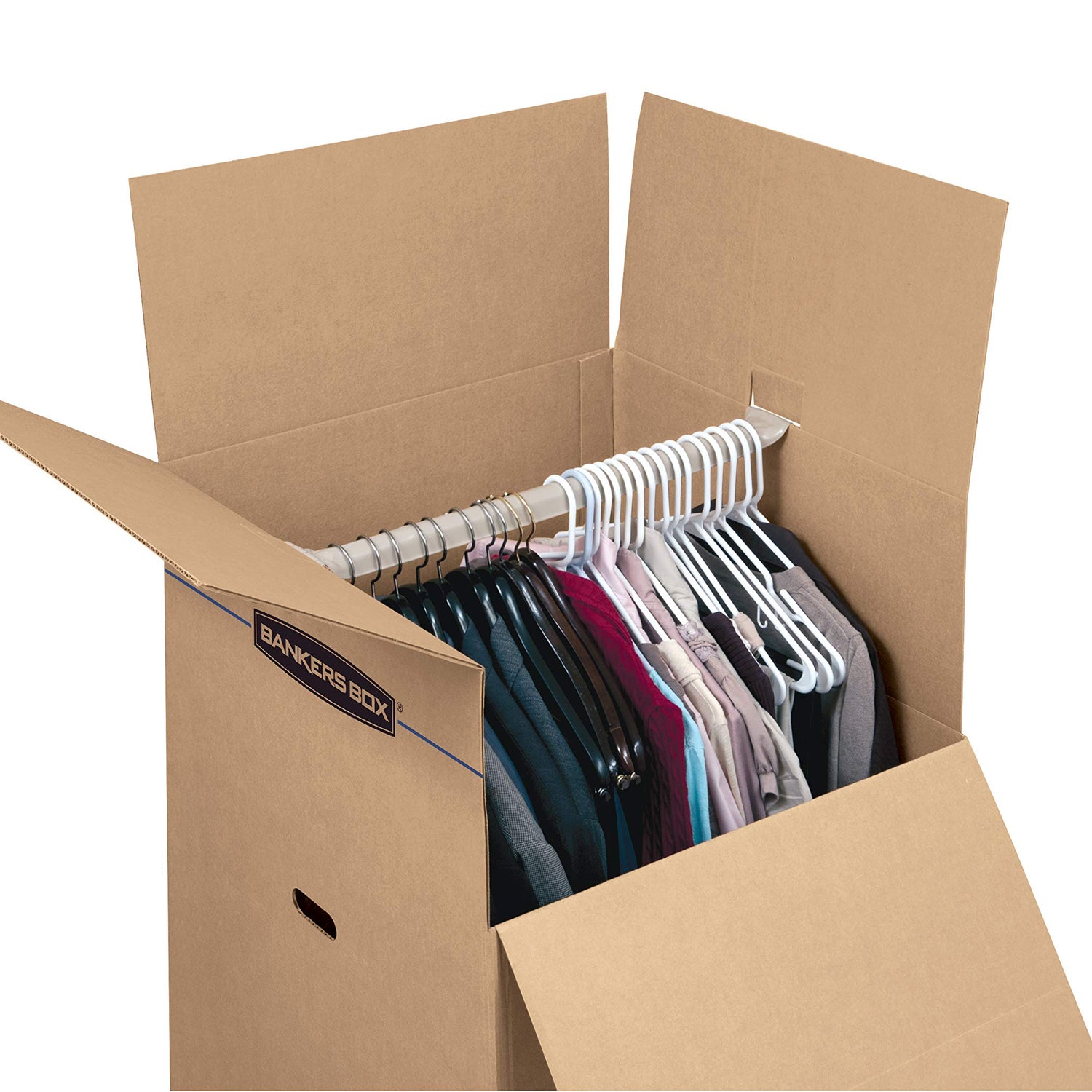 Details: Bankers Box SMOOTHMOVE WARDROBE Box Short 20x20x34 3pk. Wardrobe boxes are designed specifically for moving and storage of hanging items. Each box includes a 20" hanger bar which can accommodate up to 2 linear feet of closet items. The wardrobe box closes completely to keep articles clean. Boxes are constructed from stronger 44 ECT C-Flute Kraft corrugated board and are reusable and recyclable. The actual assembled size of one box is 20 x 20 x 34 Inches.