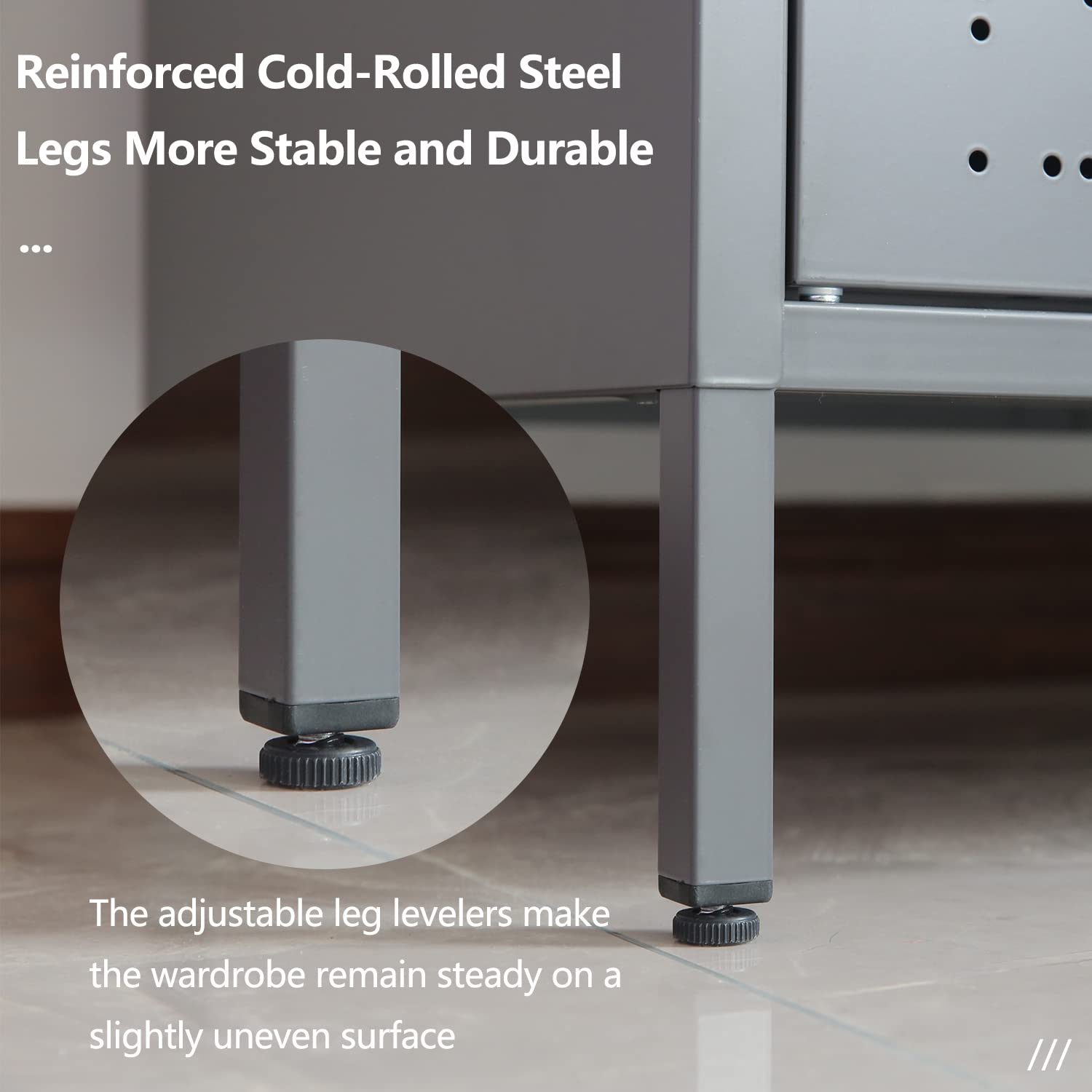 - Well-designed: Uneven floors, worried about tilting the closet? Don't worry, our steel wardrobe cabinet are equipped with leg adjustments and are very stable! Plus, the magnetic mute pad will not only give you a quiet closing sound, but will also keep your closet doors closed!