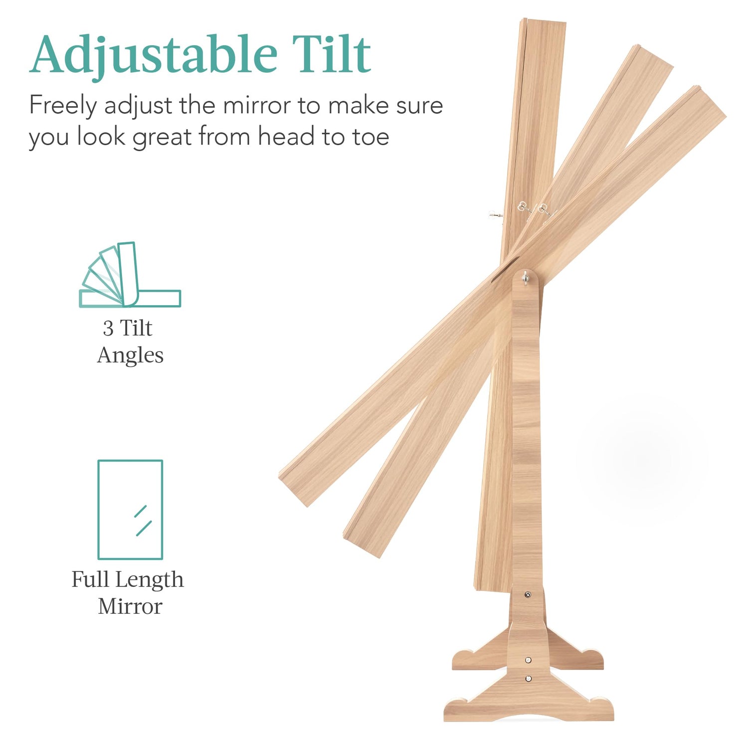 • ADJUSTABLE TILT: A set of pegs and fastener holes on the legs let you adjust the angle of this mirror to 3 different positions to achieve the best head-to-toe view of your outfit