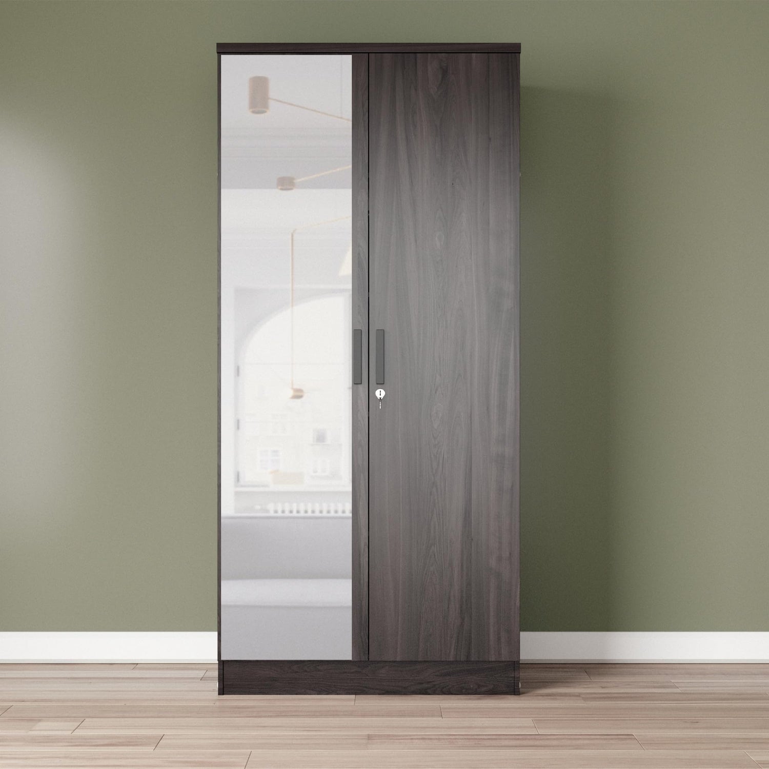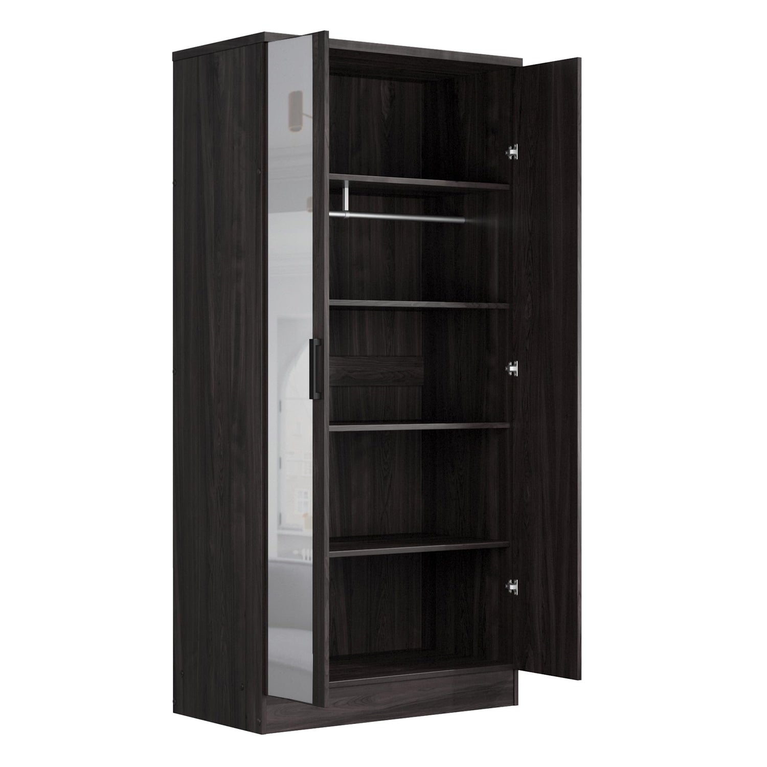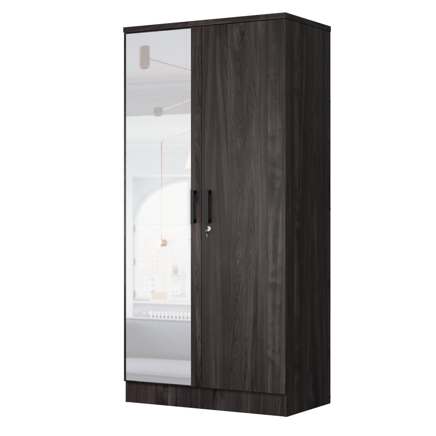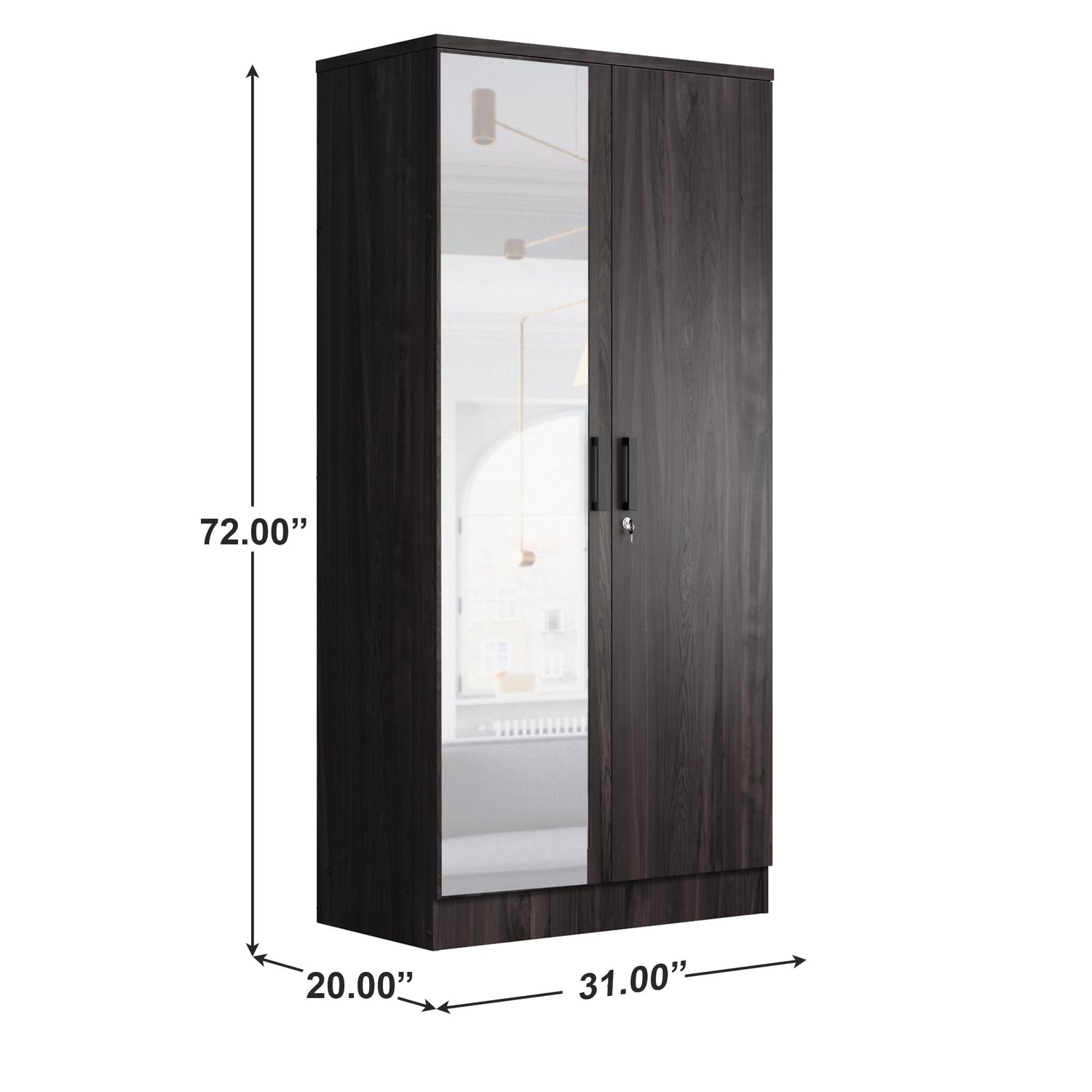 Details: Two Door Armoire Wardrobe with Mirror in Tobacco Keep your room, basement workshop, or storage shed organized and optimized with the Better Home Products Harmony Two Door Armoire Wardrobe with Mirror. Crafted of durable laminated engineered wood, this cabinet strikes a tall, clean-lined rectangular silhouette. Two lockable doors with silver finish plastic bar pull smoothly open to revel one fixed top shelf and 3 removable shelves that can be used to store clothing, bed sheets, pillowcases, blankets, baskets of smaller equipment?s and so much more. The heavy-duty crossbar garment rod allows you to neatly hang your clothes up if you prefer. The fixed mirror on one door offers you a comprehensive view of your look. Available in Beech (Maple), Black, White, Mahogany, Tobacco, and Gray color finish options. Assembly required.