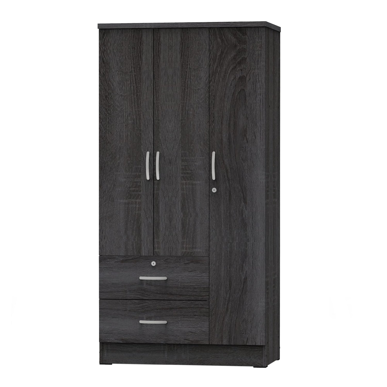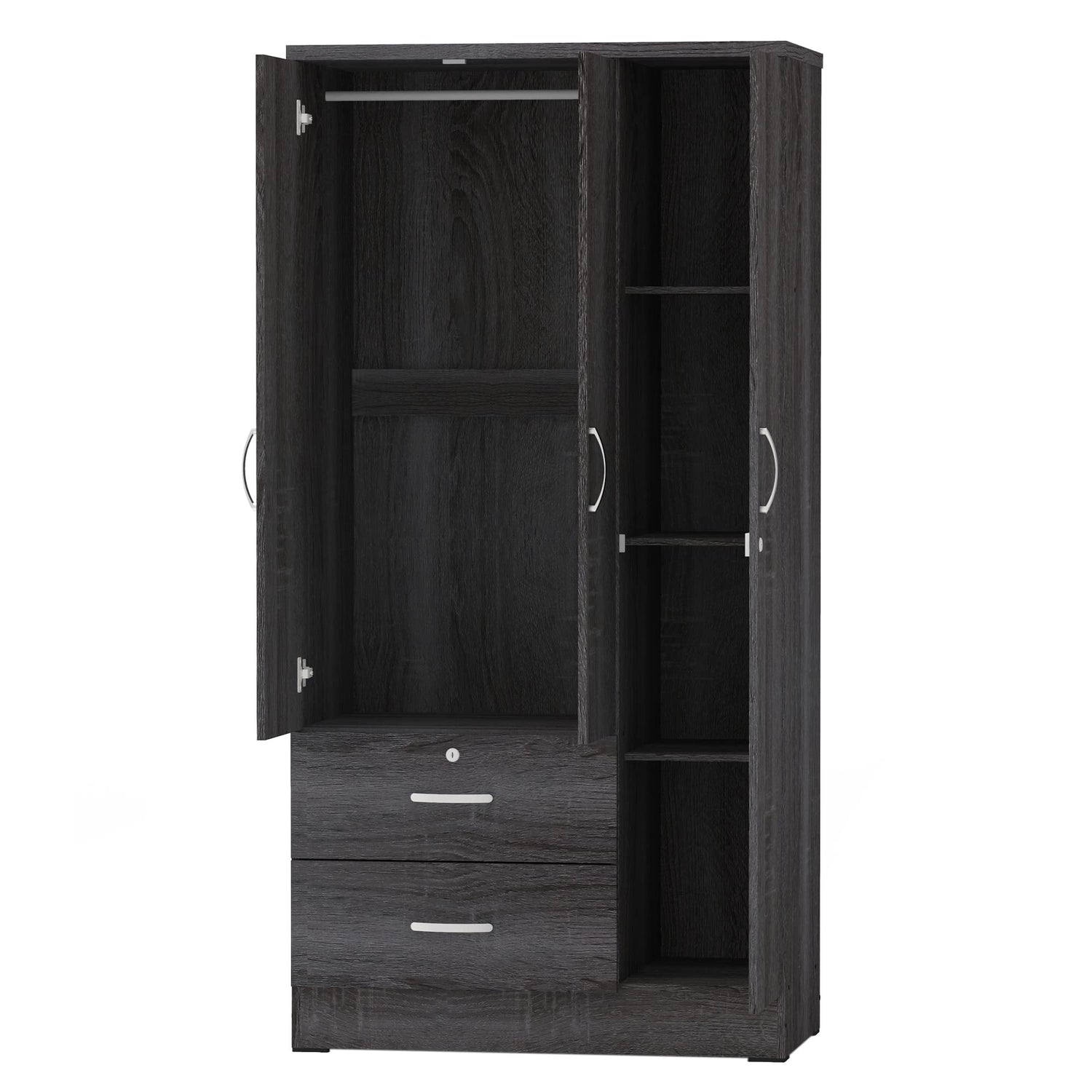 Details: Flexible and versatile the Better Home Products Symphony Wardrobe Armoire Closet with Two Drawers features multiple storage spaces to meet your every need. Made from premium engineered wood, the armoire is quite durable and sturdy. Symphony features a clothing bar inside the cabinet that lets you hang more wrinkle-prone pieces. The 2 spacious drawers provide the perfect spot for accessories or underclothing. There are 3 shelves to store folded jeans and pants. This wardrobe closet is ideal for bedrooms with contemporary decors. The silver finish plastic handles complete the piece and add accessibility. It is easy to care for and can be wiped clean with a dusting cloth. Available in Beech, Black, White, Mahogany, Tobacco and Gray color options.