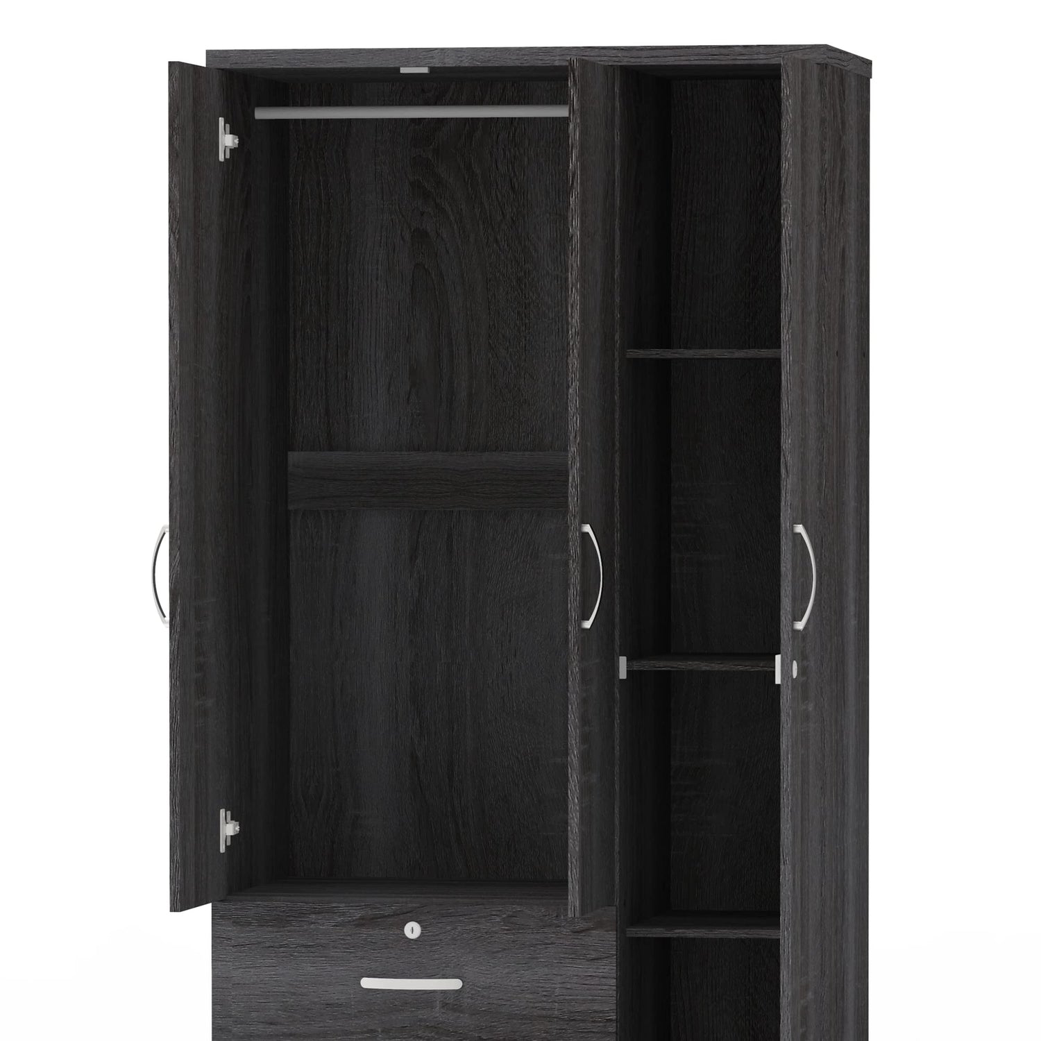 • Constructed of durable engineered wood.; Equipped with 3 shelves hiding behind single door that can easily accommodate folded clothing or join the trend and dump all your miscellaneous items in baskets and store them here.; Easy to assemble, simple and clear instructions and complete accessories are included. Do not use power tools to assemble your furniture.; Dimension 72" H x 36" W x 20" D; Product Weight 147lbs; Finish Gray