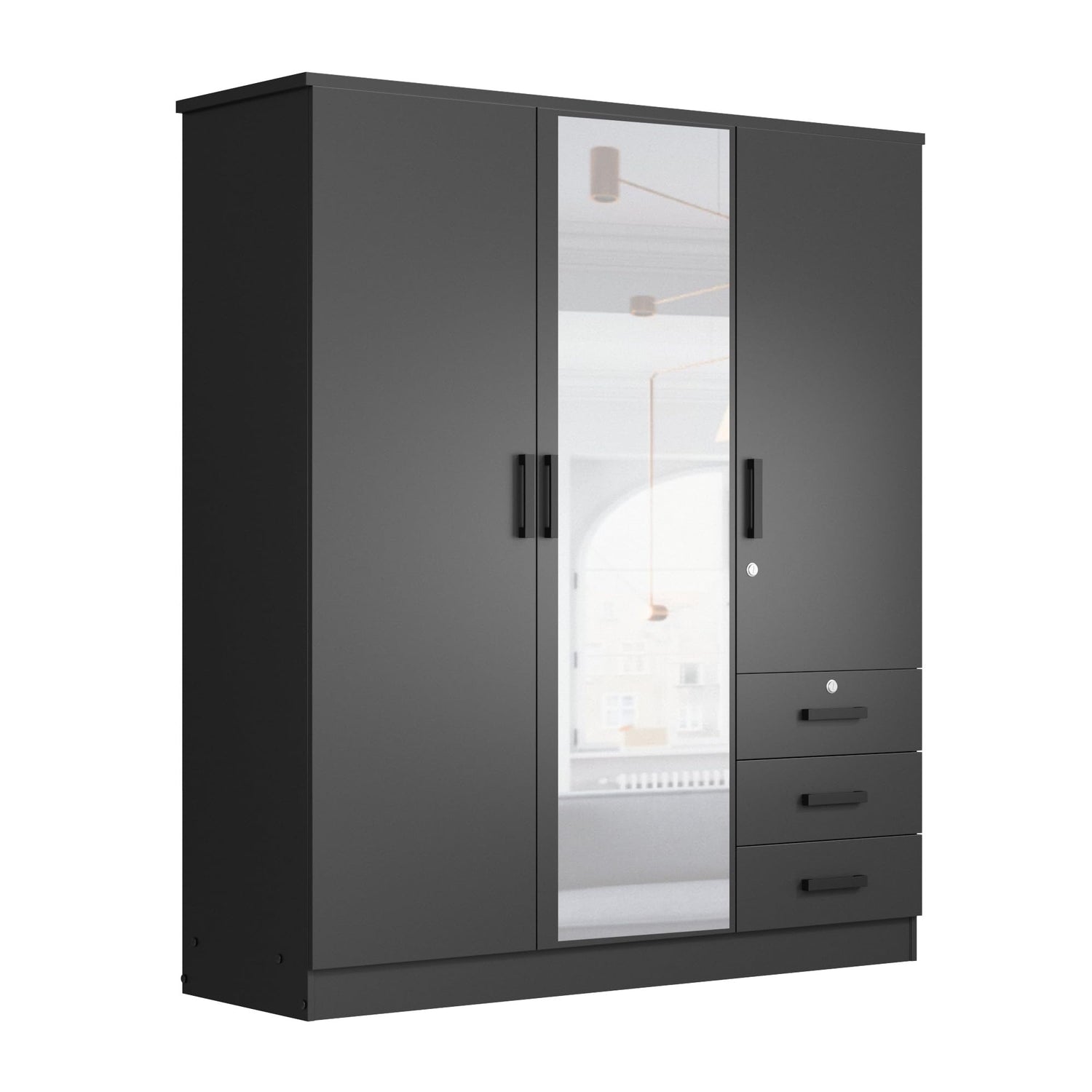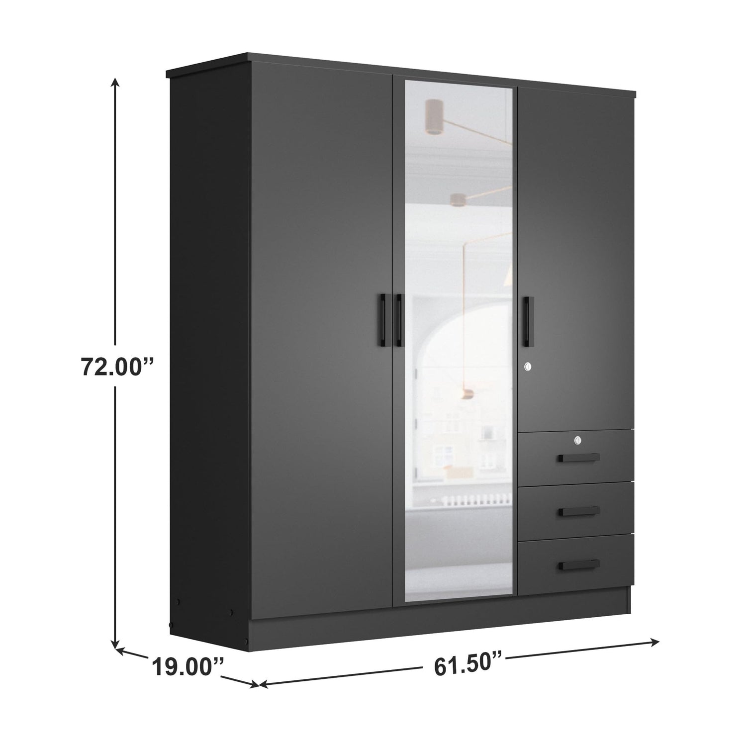 Better Home Products Violet Wardrobe Armoire Closet with Mirror, Three Drawers and 3 Doors. (Black)
