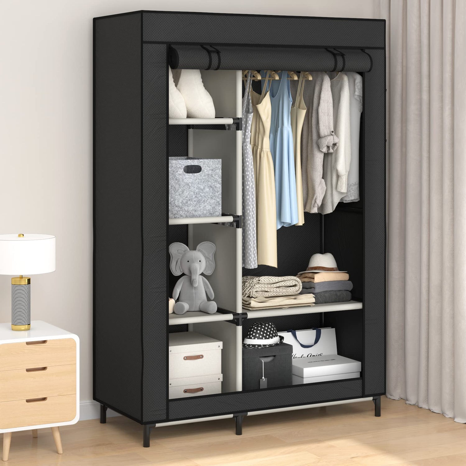 - 【Clean and sanitary】The non-woven jacket of the wardrobe can effectively isolate dust and moisture in the air. Make the items in the wardrobe not easy to be damaged due to moisture. The curtain of the wardrobe can be rolled up, which is more convenient to clean the interior of the wardrobe.