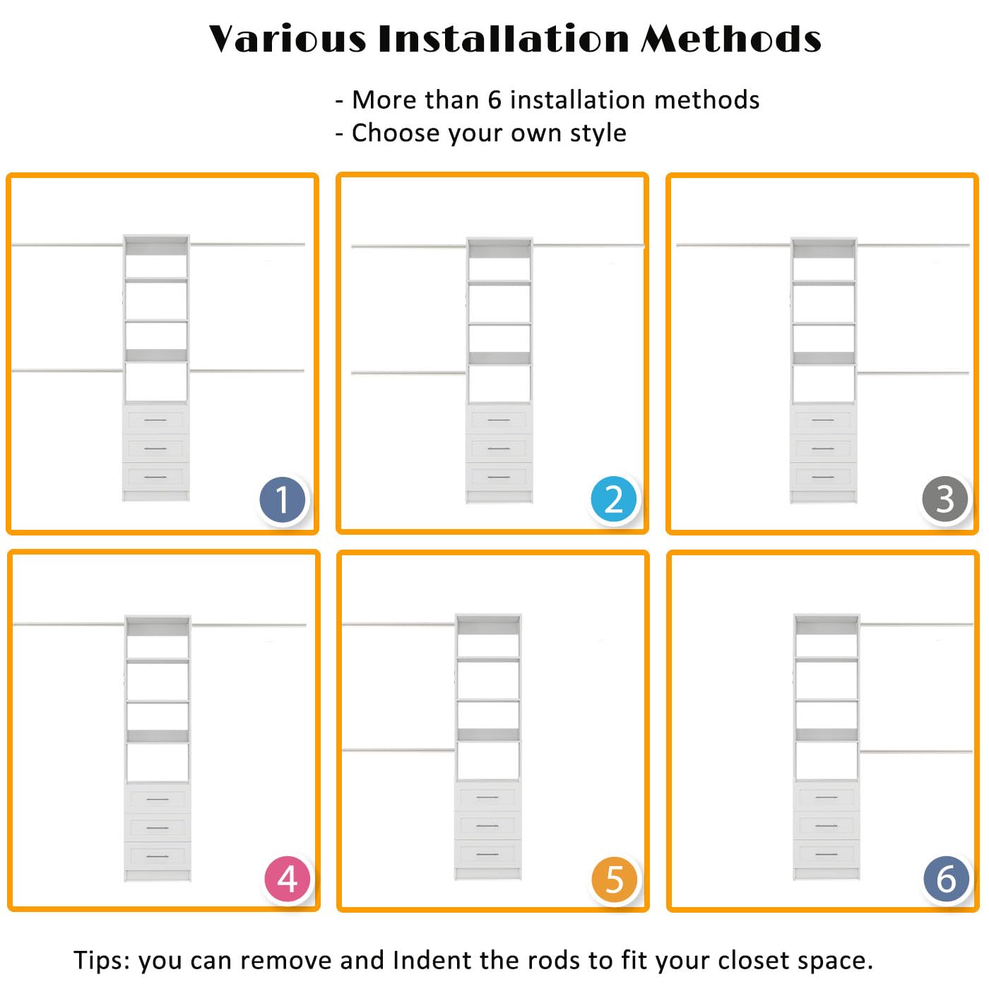 - 【Walk-In Hanging Closet System】This walk-in closet system offers a custom, spacious solution for organization and storage. 4 expandable hanging rods for organizing skirts, T-shirts, jackets, dresses, coats, and outerwear. 3 independent drawers for discreet storage of undergarments and personal items. 3 adjustable open shelves for hats, shoe boxes, and jewelry. The bottom area keeps shoes organized and easily accessible.