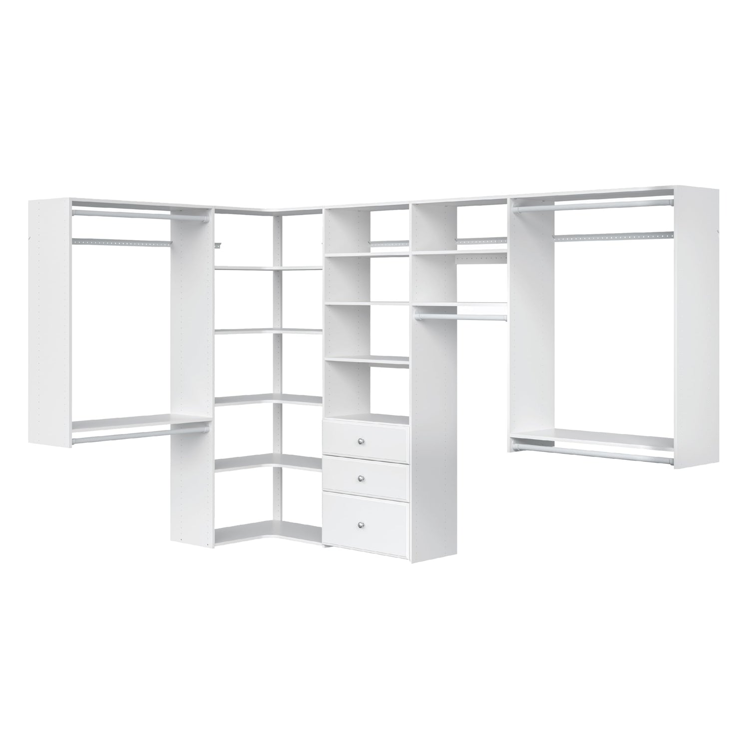 • A PLACE FOR EVERYTHING. Six 30x30-inch L-shaped corner shelves maximize closet storage space, while providing greater accessibility than other closet organizers. Vertical panels allow installation of Easy Track accessories, sold separately, for complete storage options: chrome or wire baskets, sliding tie/jewelry rack and belt rack, hamper, and sliding valet rods. Comes with white vinyl coated steel wardrobe rods. Chrome replacement rods are sold separately for a more elegant look.