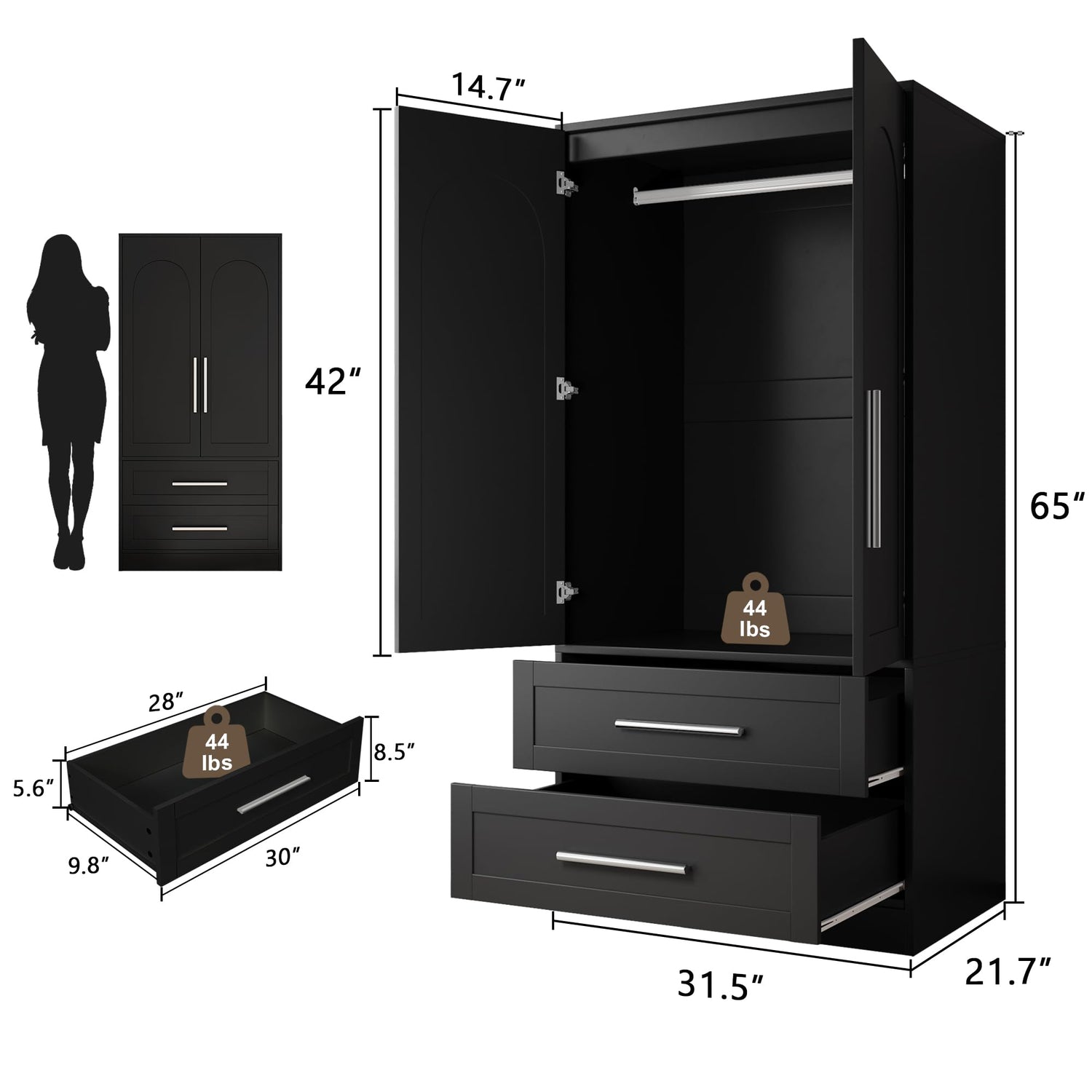 - 【Large Capacity Wardrobe】Solid wood closet with 2 doors and 2 drawers, bigger storage storage space (63x16x31in). Clothes rod can store skirts, sweatshirts, suits, etc., and drawers can store underwear, socks and other small items. It can meet your categorized storage needs and get rid of the cluttered bedroom.