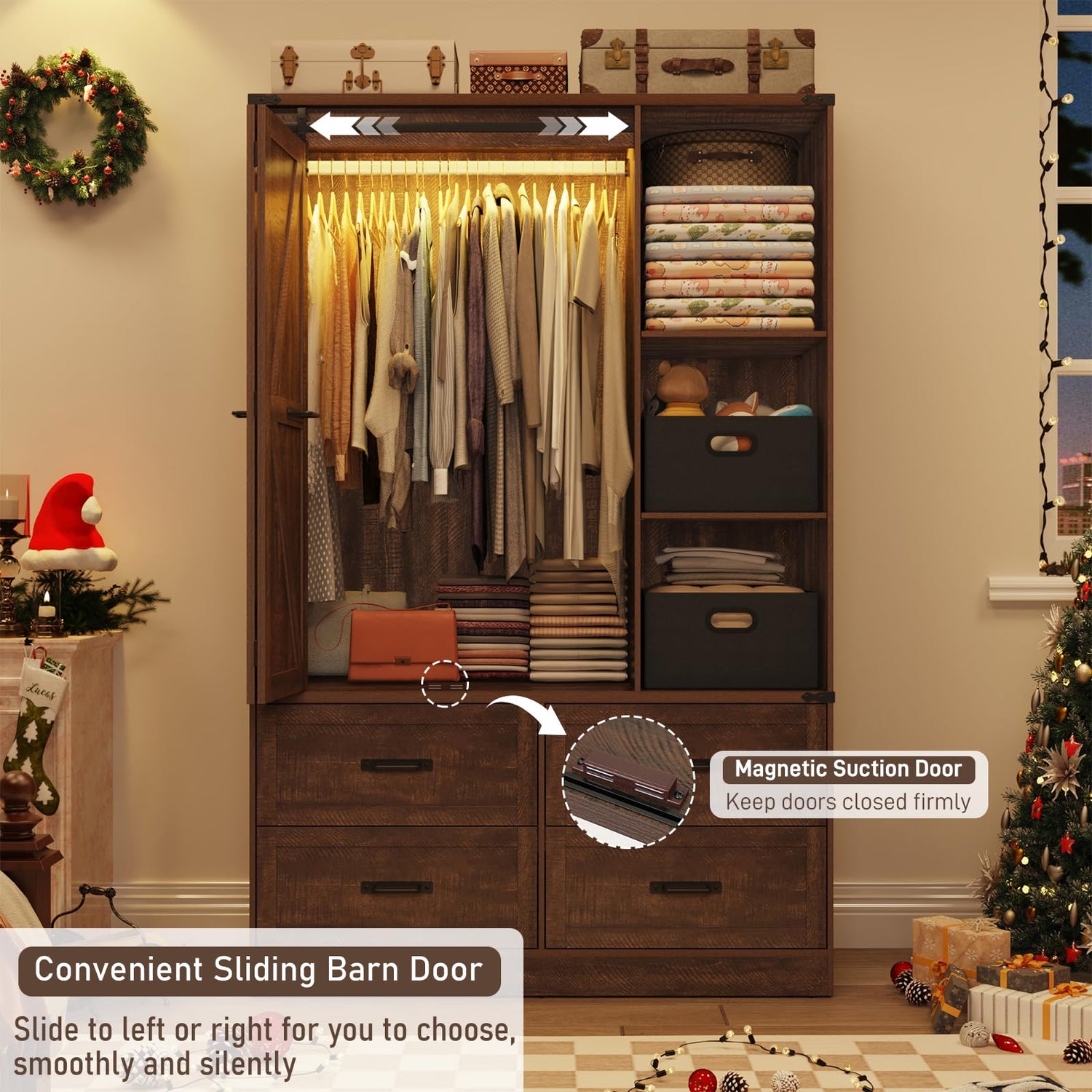 Farmhouse 3 Doors Armoire Wardrobe Closet w/Folding Sliding Barn Door and Lights, LED Armoire Closet w/Drawers for Bedroom, Freestanding Wooden Wardrobe Storage Closets w/Hanging Rod,Rustic Brown