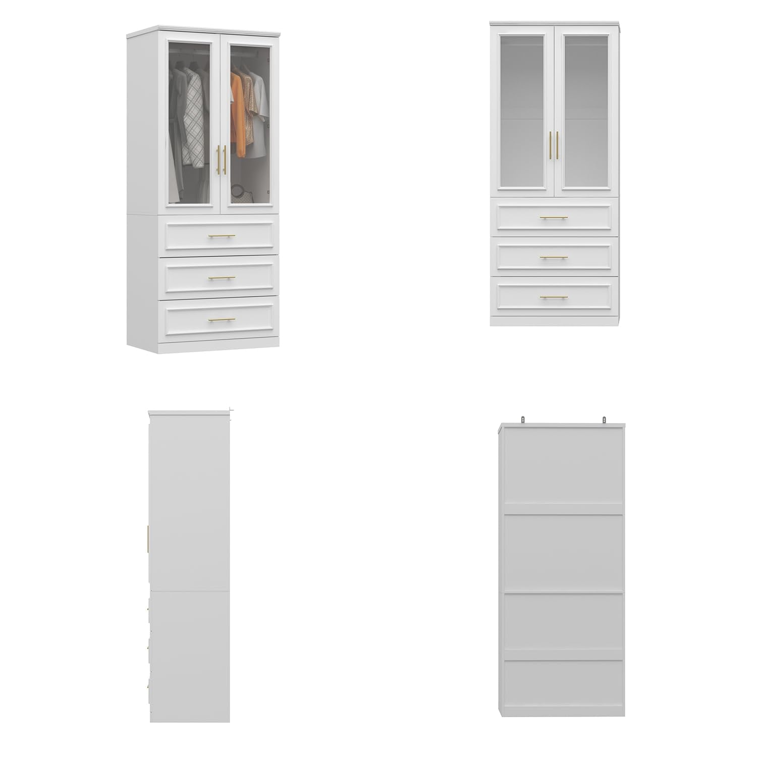 Details: FUFU&GAGA Wardrobe Closet with Glass Doors, Modern White Bedroom Armoire with Gold Handles, Modern Clothes Storage Cabinet with 3 Drawers, Hanging Rod, 31.7”W x 19.3”D x 74.8”H