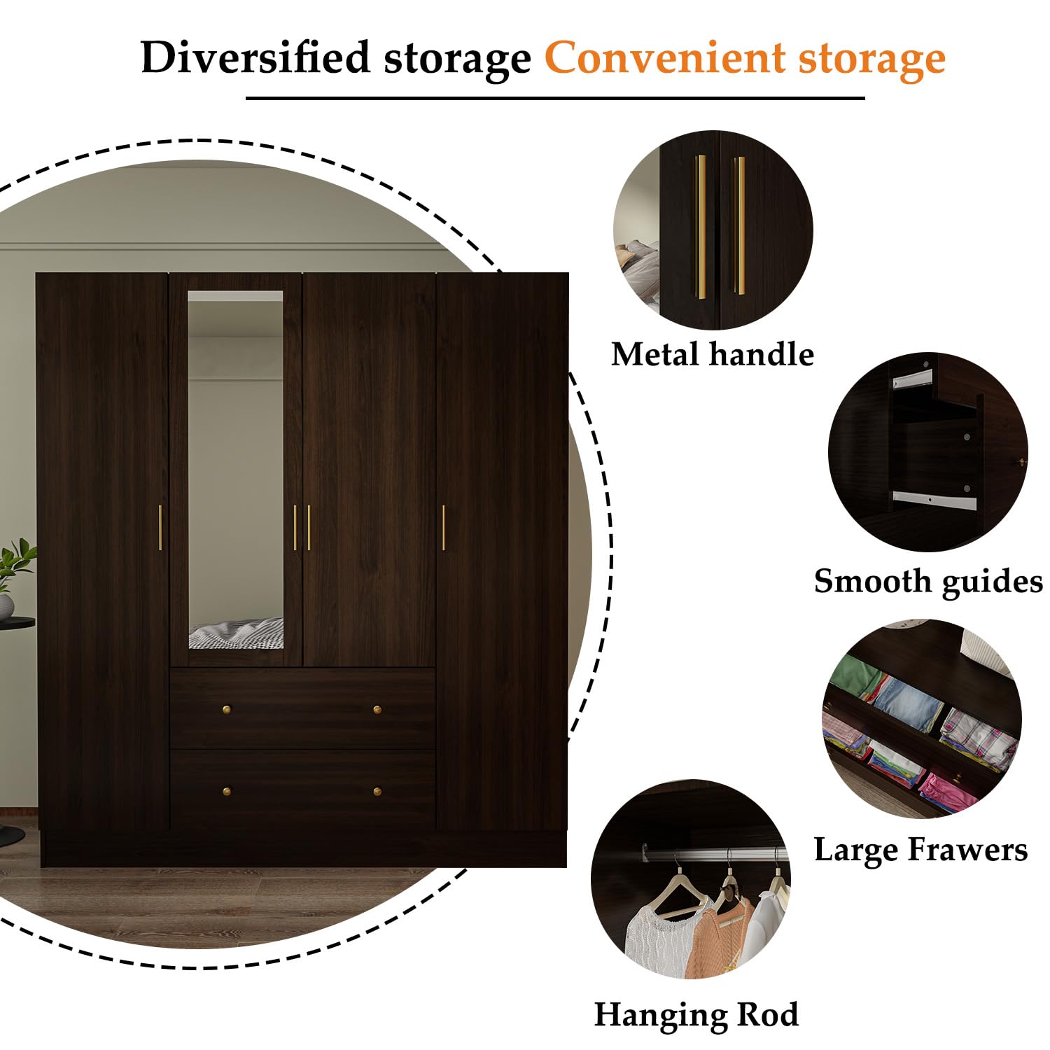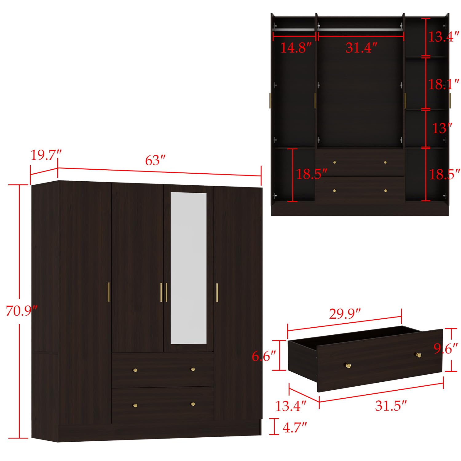 FUNSIR 4 Doors Bedroom Wardrobe, Wood Armoire with Mirror, 2 Clothes Hanging Rails, 5 Storage Shelves and 2 Drawers, 63" Wide Bedroom Storage Unit Clothes Organizer, Dark Brown(70.9" H)