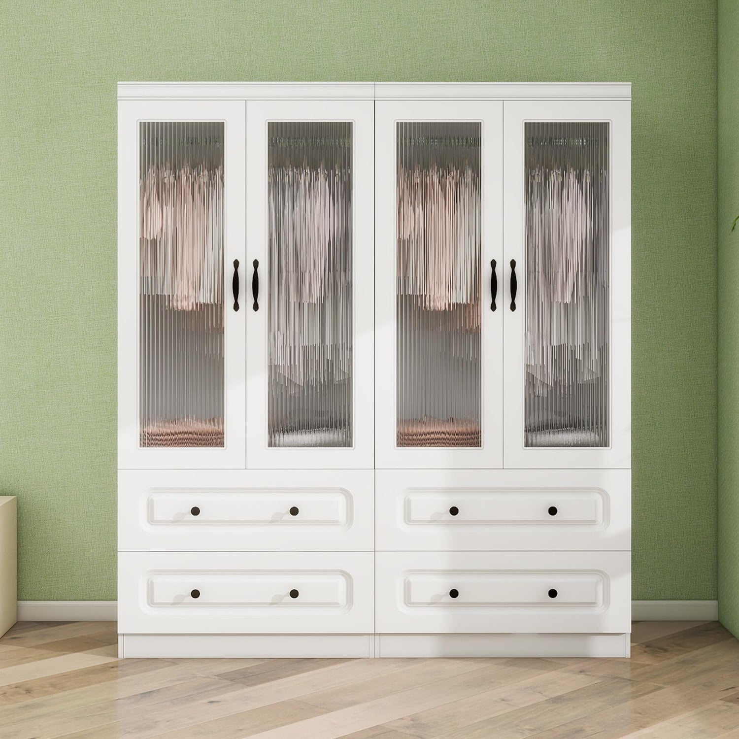 GraceGrove Armoire Wardrobe Closet with 4 Glass Doors and 4 Drawers, Closet Cabinet with and Hanging Rods and Storage, Wood Wardrobe for Bedroom, Tall Armoires and Wardrobes White