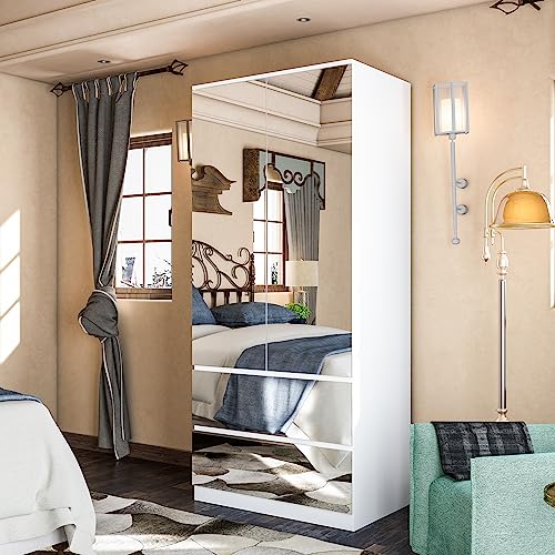 Hitow Mirror Wardrobe Armoire with Drawers, Wardrobe Armoire Closet with Glass Full Length Mirror Doors Drawers & Hanging Rod, Wood Wardrobe Clothes Storage Cabinet for Bedroom, White