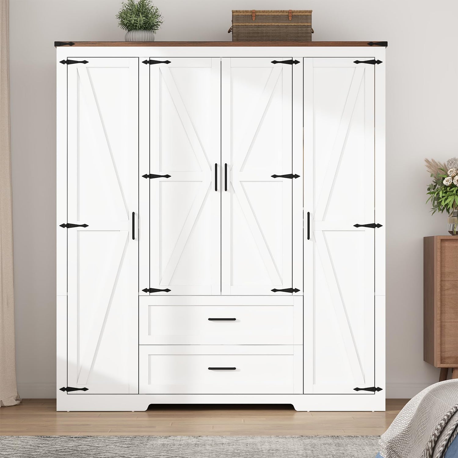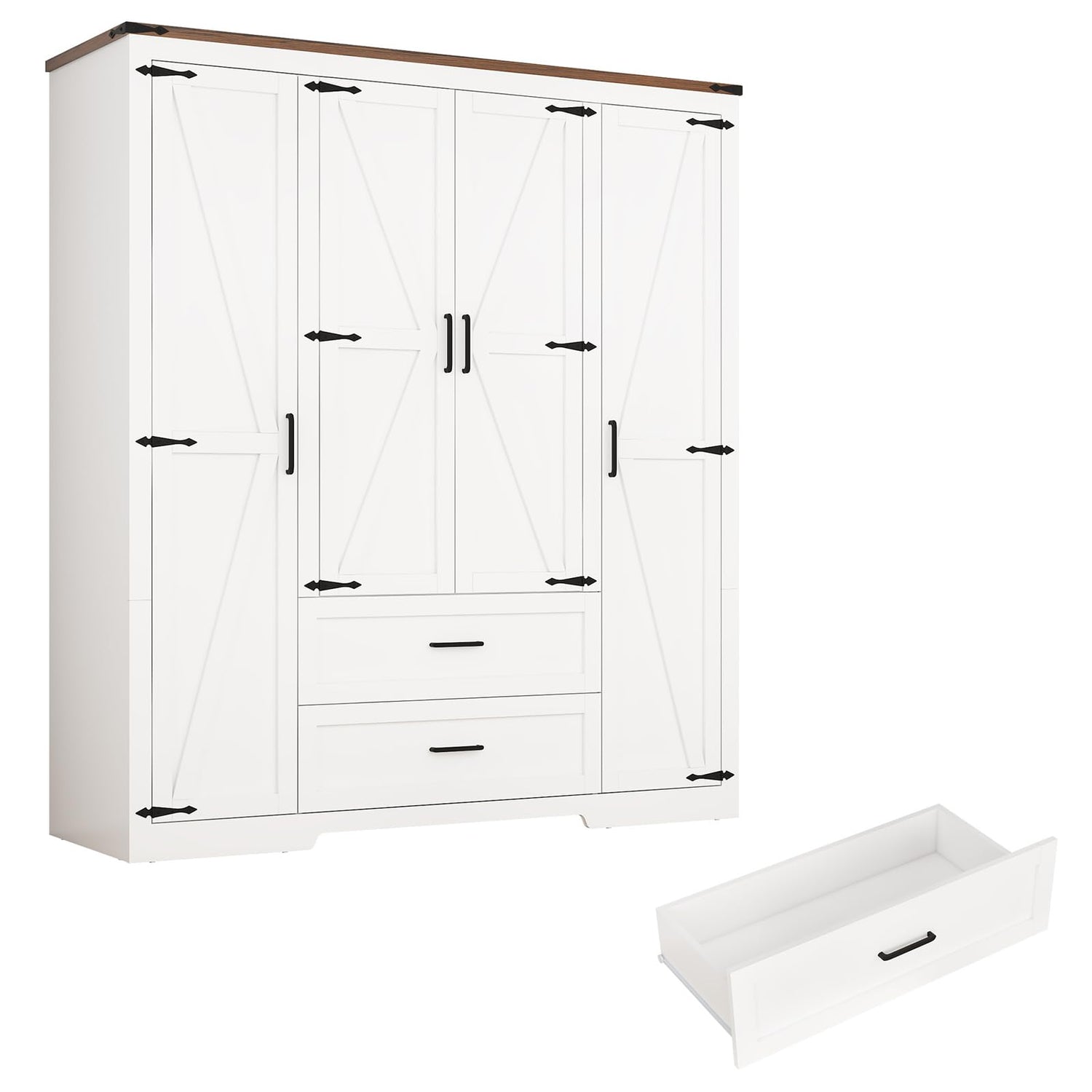 Hlivelood 4 Doors Wardrobe Armoire Closet with Doors and Drawers, Farmhouse Wooden Armoire Storage Cabinet with Shelves & Hanging Rod for Bedroom, White