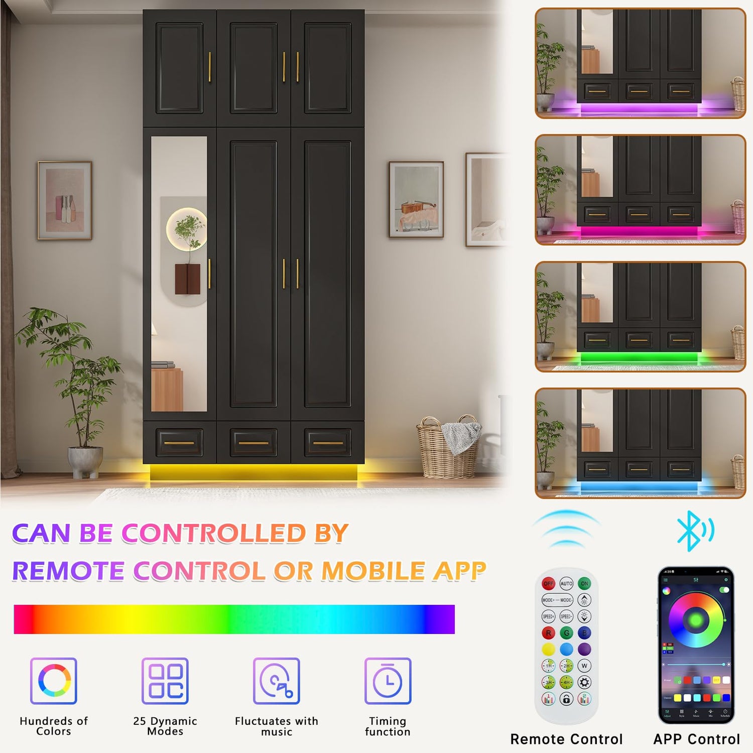 - 【Cabinets with Multiple RGB Lights】Wardrobe closet with LED lights with variable RGB colors, control the different styles of lighting effects you want by manual buttons or mobile apps. This LED armoire with drawers can enrich your bedroom space and can also be used as a night light to avoid darkness