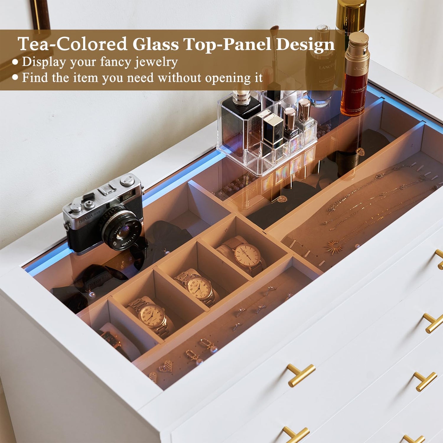 JanflyHome Closet Island with Drawers, Glass Top, Closet Island with LED Lights, Jewelry Dresser Display and Bedroom Island & Walk-in Closet Island for Bedroom, Cloakroom, White