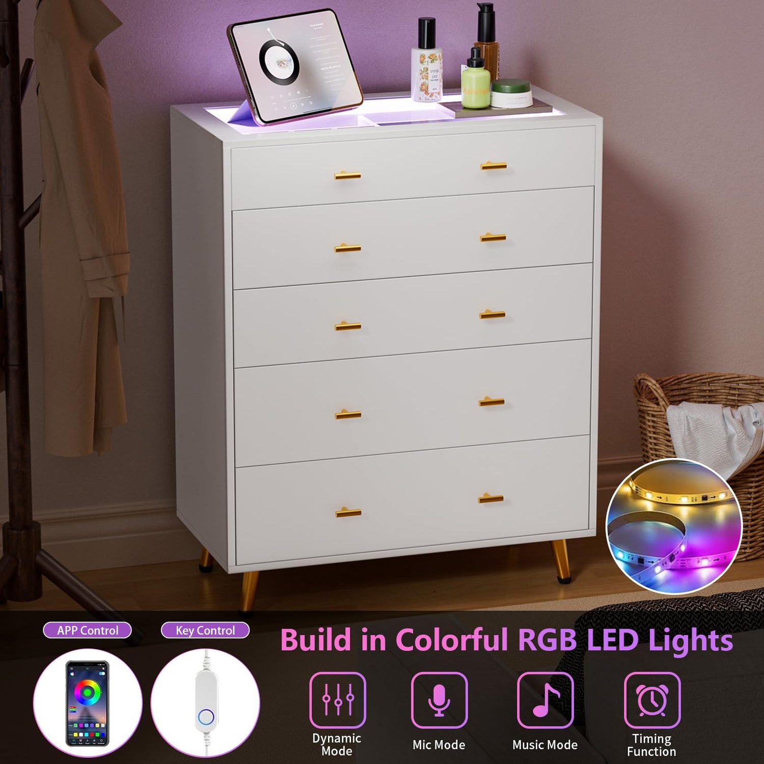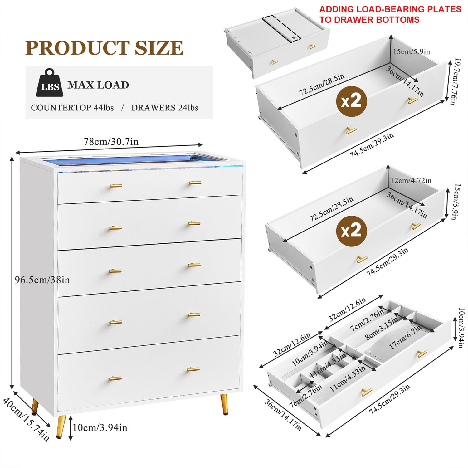 - Modern Style Drawer Dresser: JanflyHome white 5 drawer dresser with glass tabletop & led lights is in modern style; with pure white surface, gold handles and feet, it looks stylish and elegant; this storage cabinet add a touch of aesthetic to the room, also nice for shops to display articles