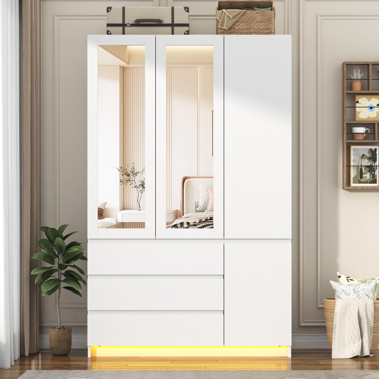 jiteentarou 3 Doors Armoire Wardrobe Closet with 3 Drawers & Mirror, Modern Wooden Bedroom Armoires with Hanging Rod Led Lights for Bedroom, White