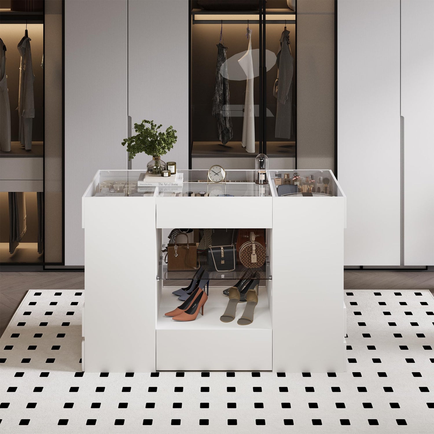 • Modern Luxury Design:Closet island with drawers glass top showcases a sleek minimalist design with a tempered glass countertop, LED lighting, and transparent glass shelves on all four sides for elegant display and easy access. Hidden drawers below provide additional concealed storage, combining beauty with functionality
