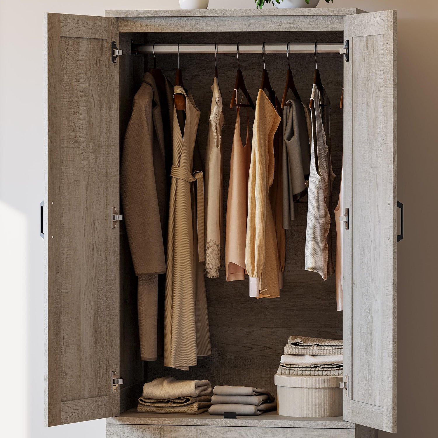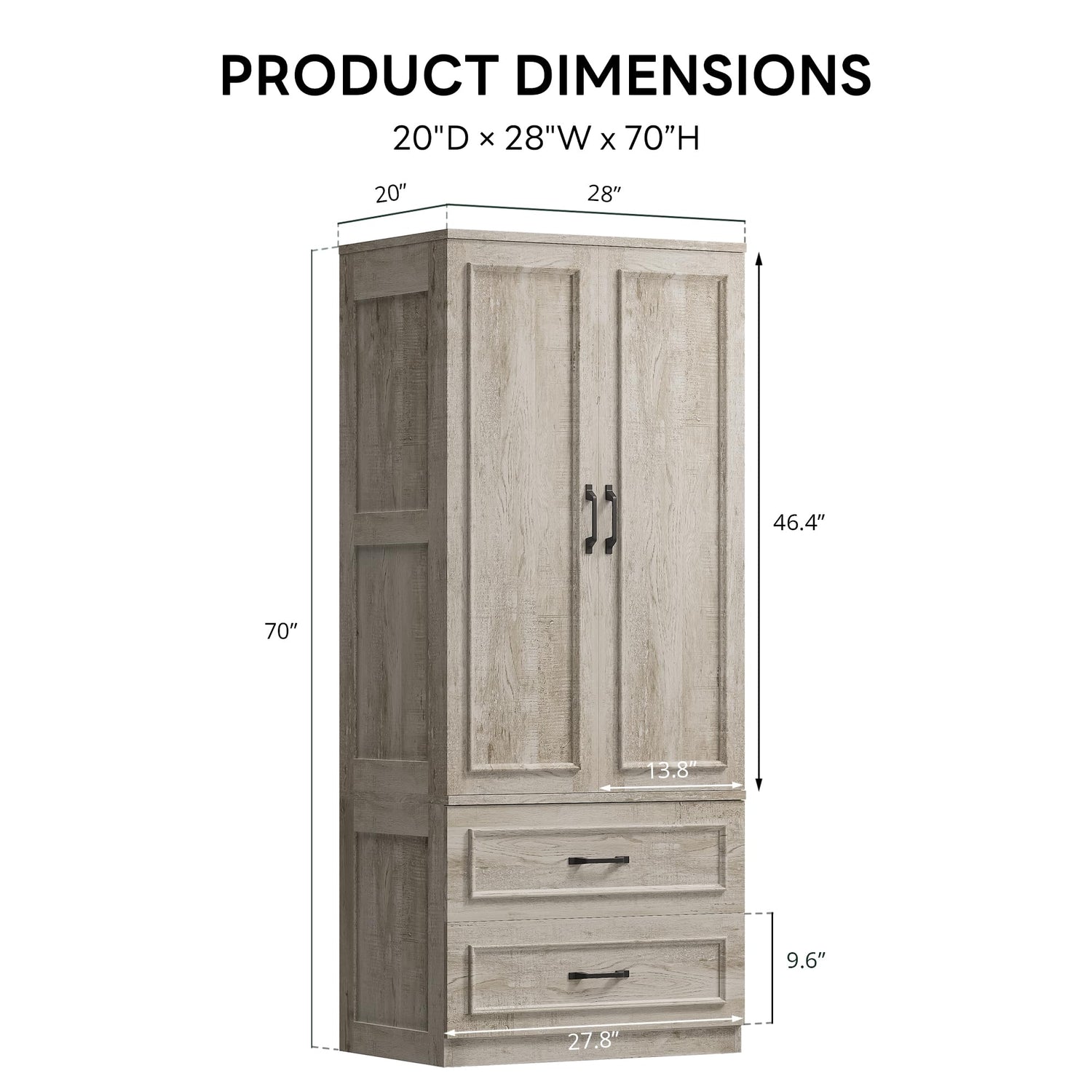 LIKIMIO Armoire Wardrobe Closet with 2 Doors and 2 Drawers 70" H x 28" W Wooden Bedroom Freestanding Wardrobe Combination for Hanging Clothes, Rustic Maple