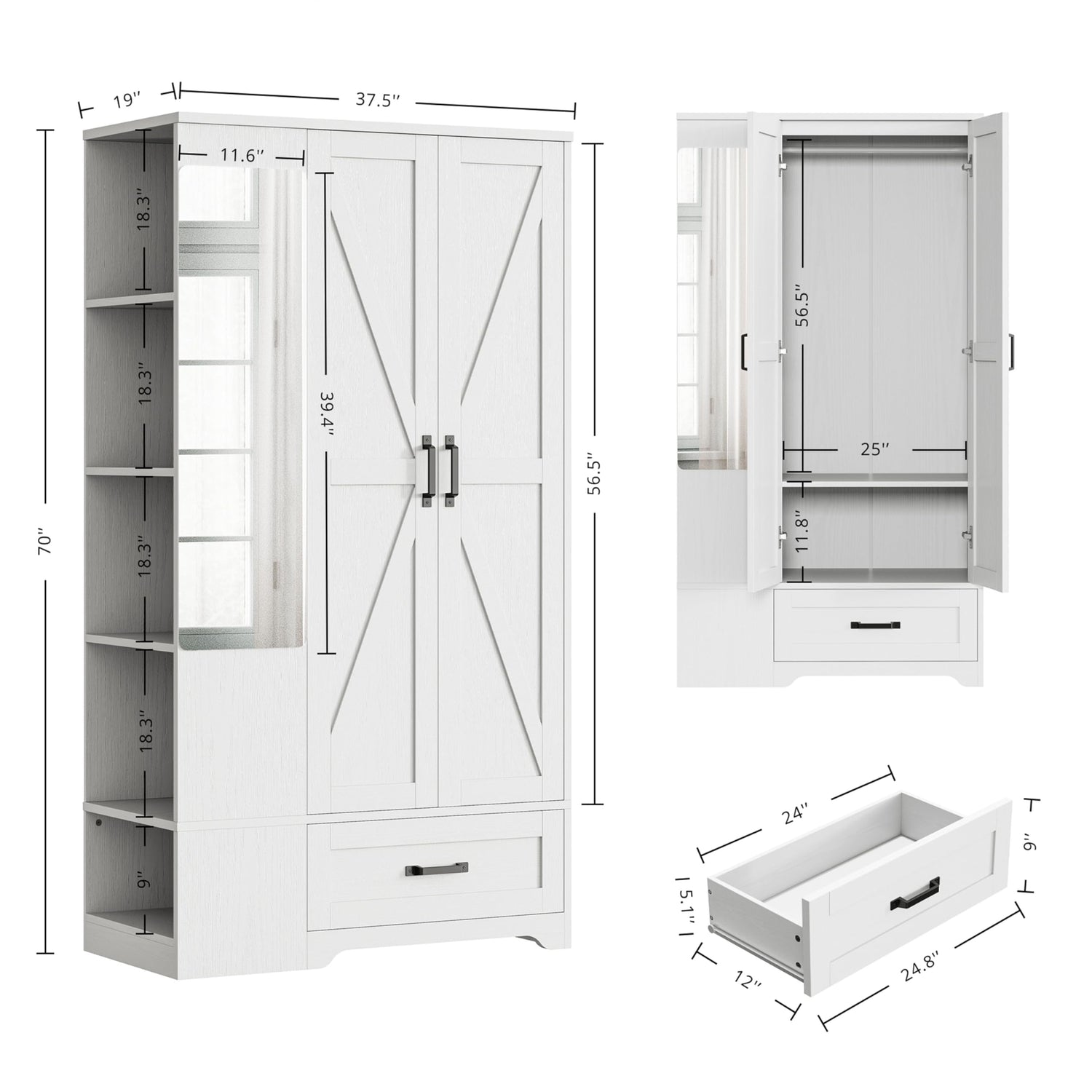 LIKIMIO Armoire Wardrobe Closet with Barn Doors and Drawers and Full Mirror and 5 Storage Shelves 70" Wooden Bedroom Wardrobe Combination for Hanging Clothes, White