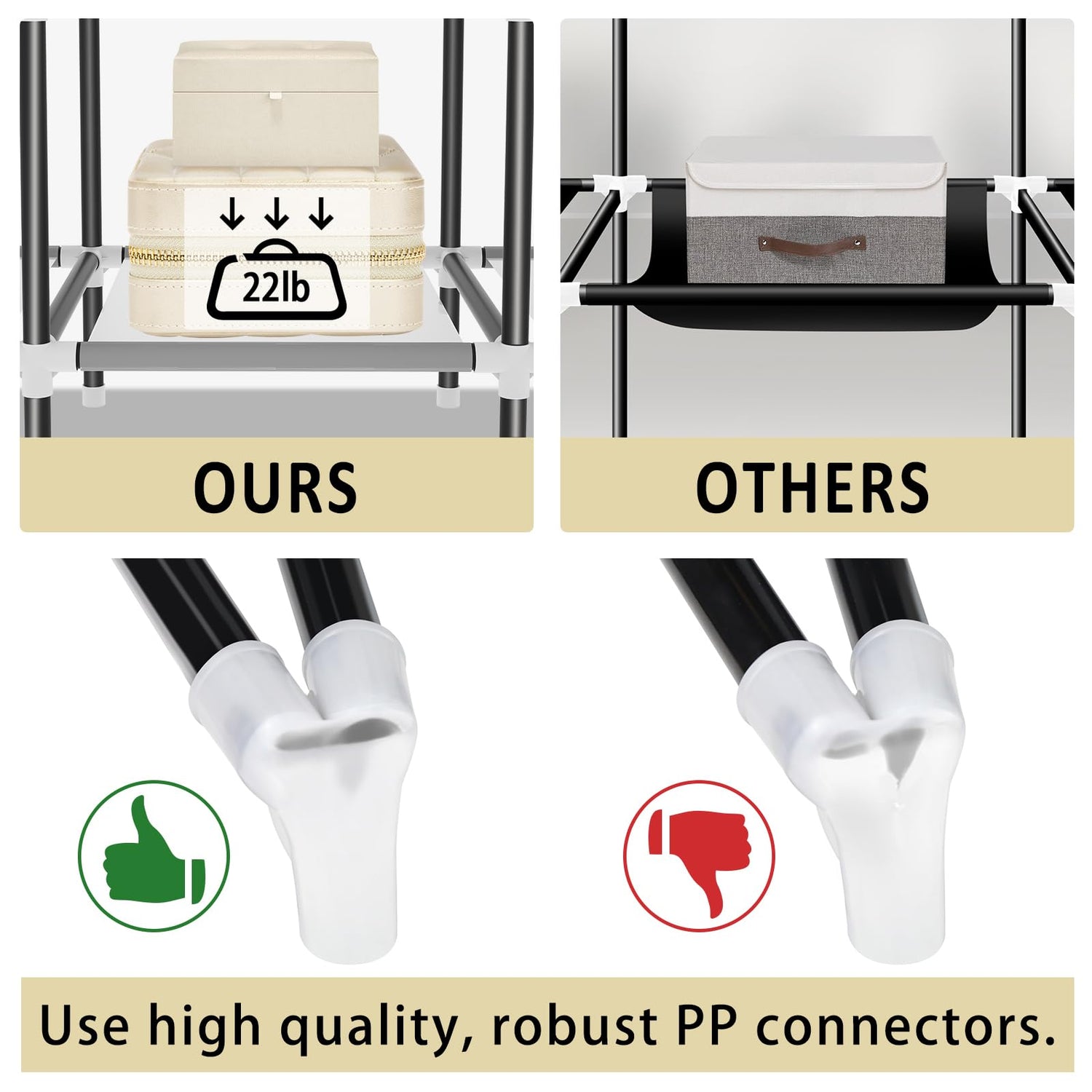 - [Sturdy Structure]:portable wardrobe closet Use reinforced PP plastic connectors to connect steel pipes. The diameter of the strong steel pipe is 19MM Thickness 0.32MM, ensuring the stability of the wardrobe. Don't worry about it collapsing or tilting.