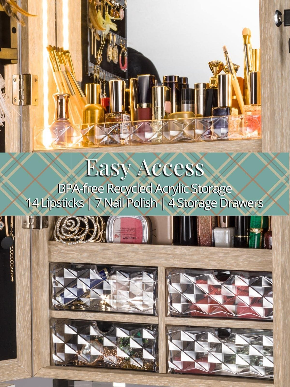 LUXFURNI LED Light Jewelry Cabinet Armoire, Standing Mirror Makeup Lockable Large Storage Organizer w/Drawers (Natural)