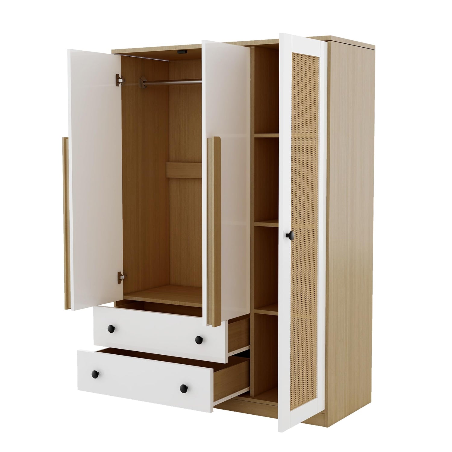 Merax 3-Doors Wooden Rattan Wardrobe Storage Shelves and Hanging Rail for Clothes for Bedroom, with 2 Drawers, White+Nature