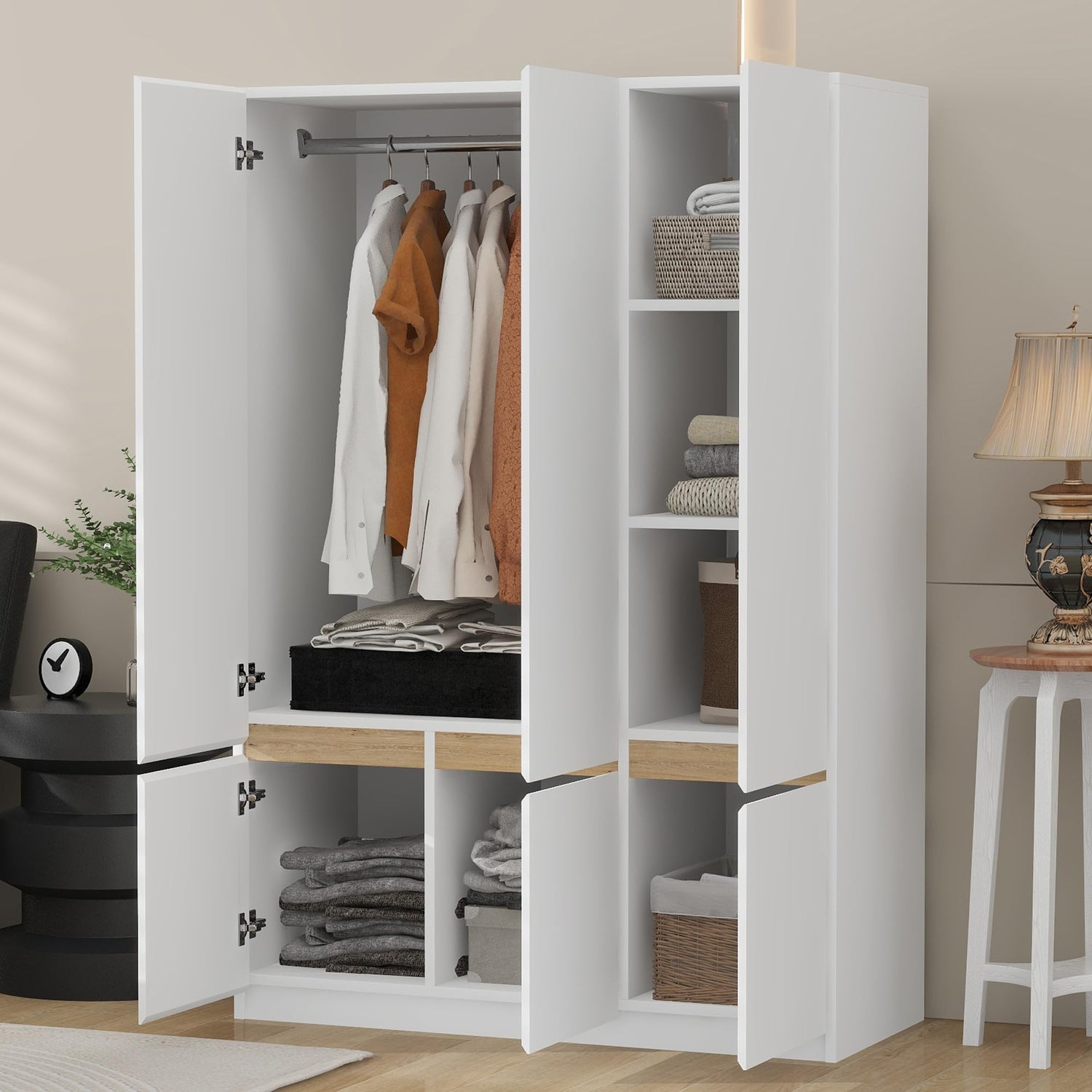 Merax 6-Doors Wooden Wardrobe Closet Storage Shelves and Hanging Rail for Clothes for Bedroom Organizer, White