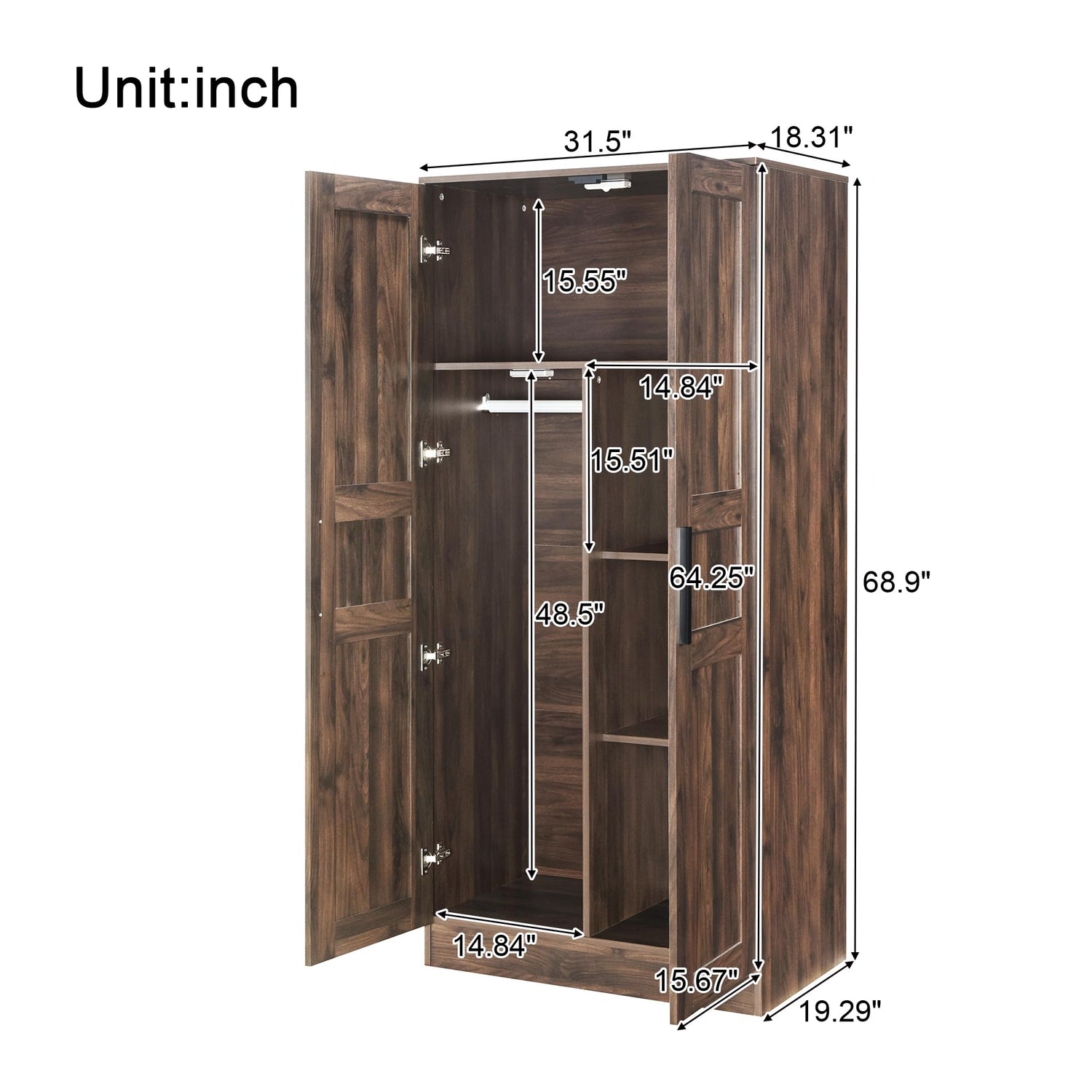 - Classic Design: The elegant farmhouse style wood grain finish, metal handles and 2-door wardrobe can easily match any furniture in the bedroom, laundry room, bathroom, toilet or entryway