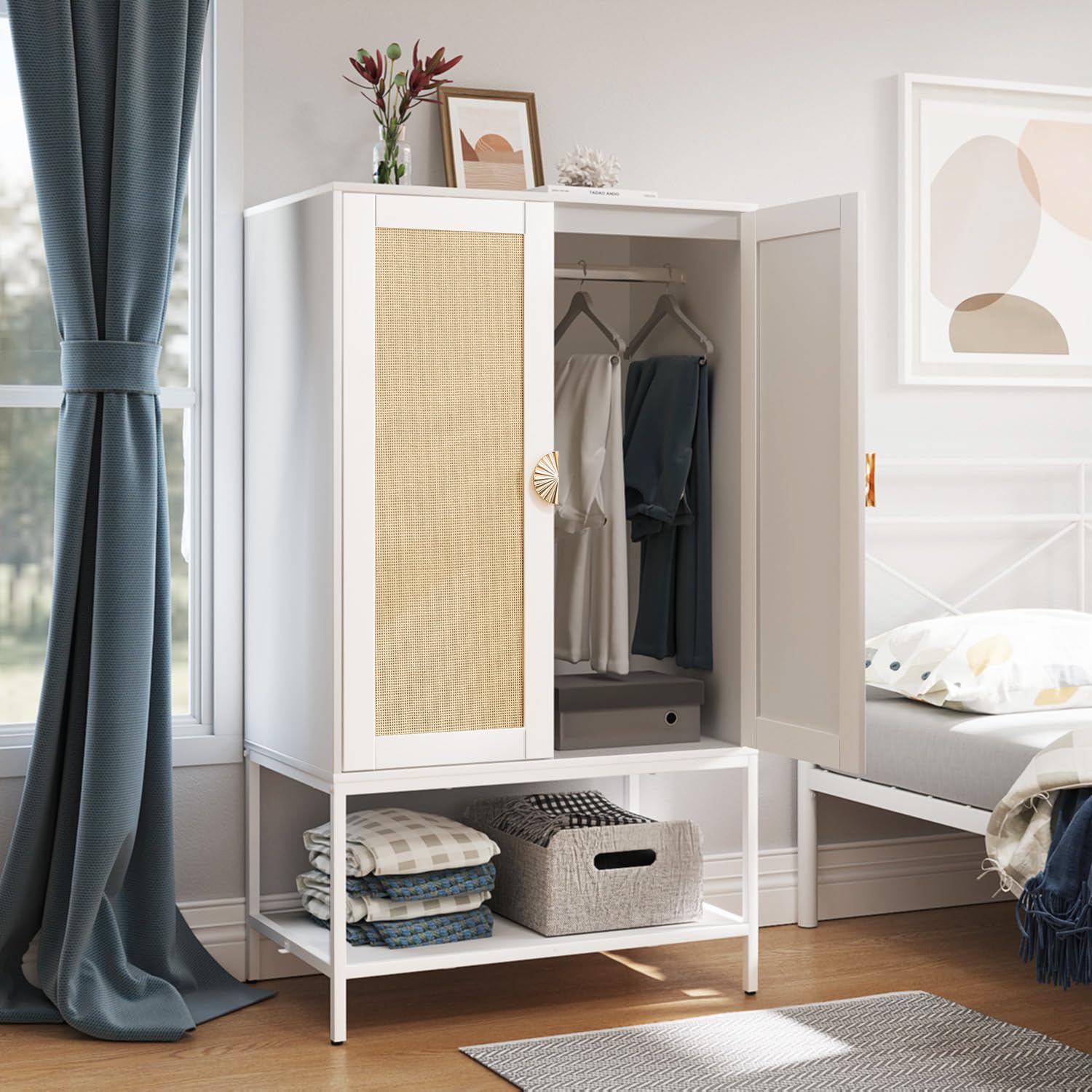 MtuxuYR Wardrobe Closet with Natural Rattan Doors Bedroom Armoires Closet Wardrobe Closets with Metal Frame Wooden Wardrobe Closet for Apartment Small Armoire for Office(White)