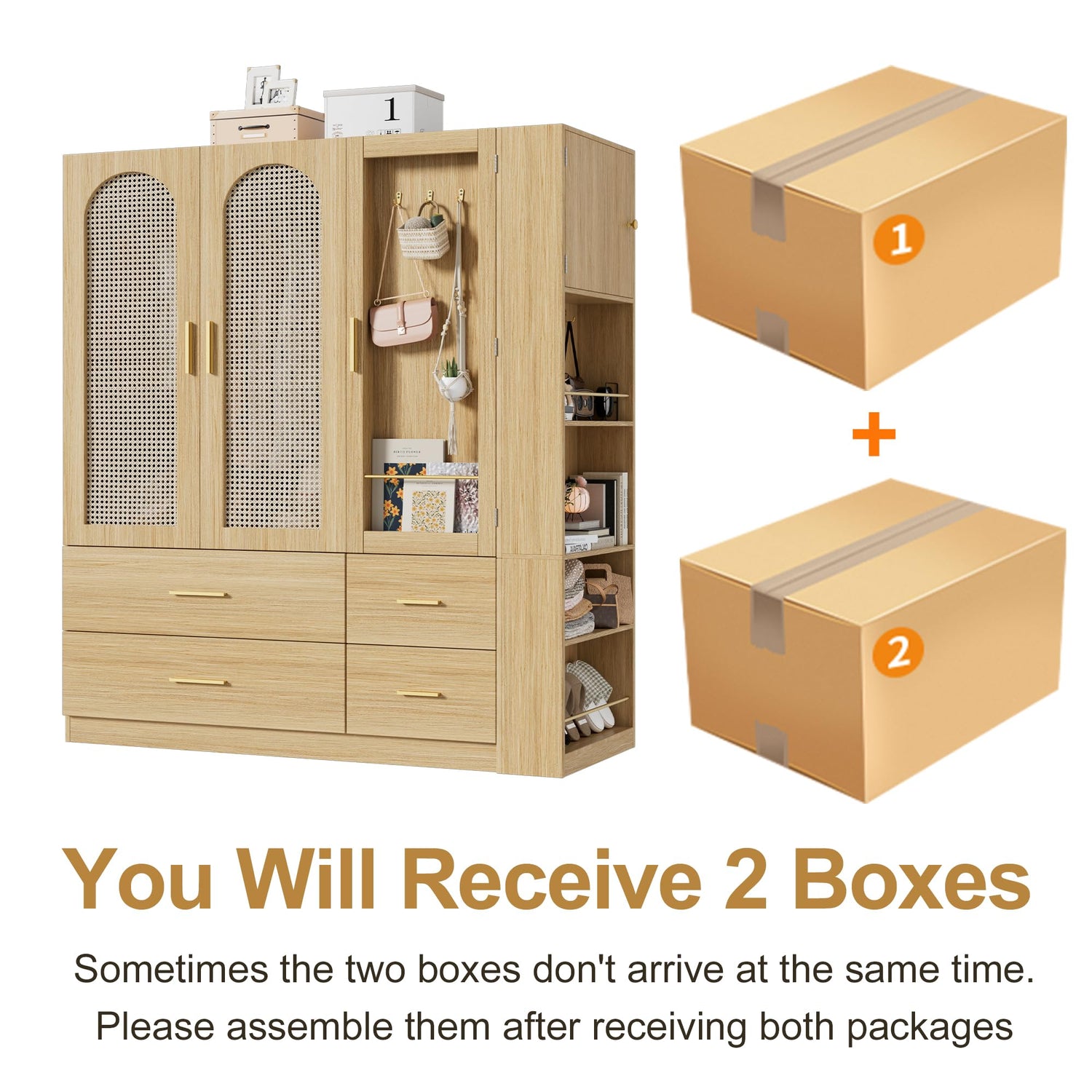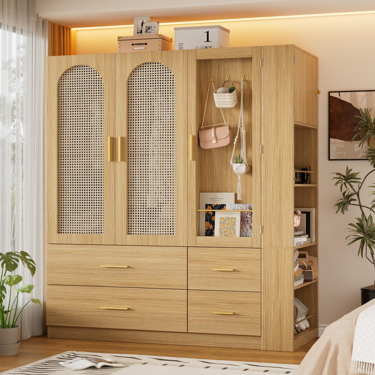 • 【Armoire Wardrobe Closet with Rattan Door】- Rattan wardrobe doors offer a unique blend of natural aesthetics and practical function. Their woven texture infuses a space with organic, warm. Beyond beauty, the inherent breathability promotes vital air circulation, preventing musty odors and moisture buildup within the closet. The semi-transparent design creates an airy, open feel, visually expanding smaller spaces while softly concealing contents. This sustainable choice effortlessly balances timeless charm with modern utility.