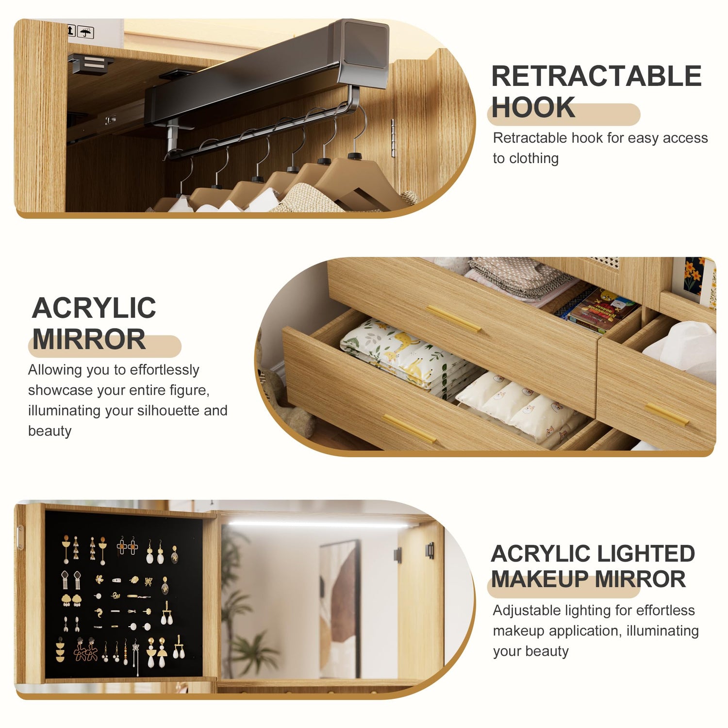 • 【Large Capacity Wardrobe】- The high wardrobe and storage cabinet are designed to meet a large number of storage needs, with dimensions of 71''H x 53.2''W x 19.7''D. This versatile wardrobe elegantly combines function and form. It features a makeup mirror, 4 open shelves for quick access, dedicated hanging space behind three doors, 4 spacious drawers for organized storage, and additional hooks for daily essentials. Perfectly designed to streamline your routine and maximize space efficiency.